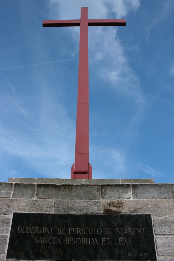 Der lateinische biblische Text wirft – auch in der Übersetzung – mehr Fragen auf, als er Antworten gibt: „Dederunt se periculo ut starent sancta ipsorum et lex“ – 1. Buch Makkabäer, 14,29 – „Sie begaben sich in Gefahr/wagten ihr Leben, damit das Heiligtum und (Gottes) Gesetz nicht vertilget würde“