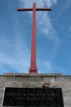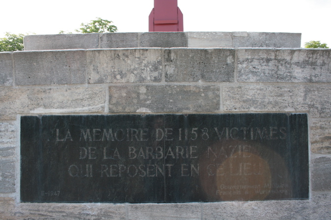 zwei Inschriften – in französischer und lateinischer Sprache – auf dem KZ-Friedhof (am Sockel des großen Kreuzes – siehe Text oben).