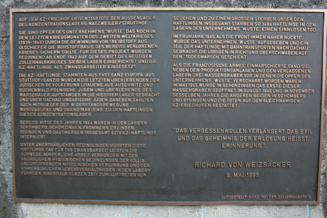 1991 ließ der Zollernalbkreis im Eingangsbereich des Friedhofs einen Gedenkstein mit einer Bronzetafel errichten, mit der die Besucher über das Unternehmen Wüste und den historischen Hintergrund informiert werden.