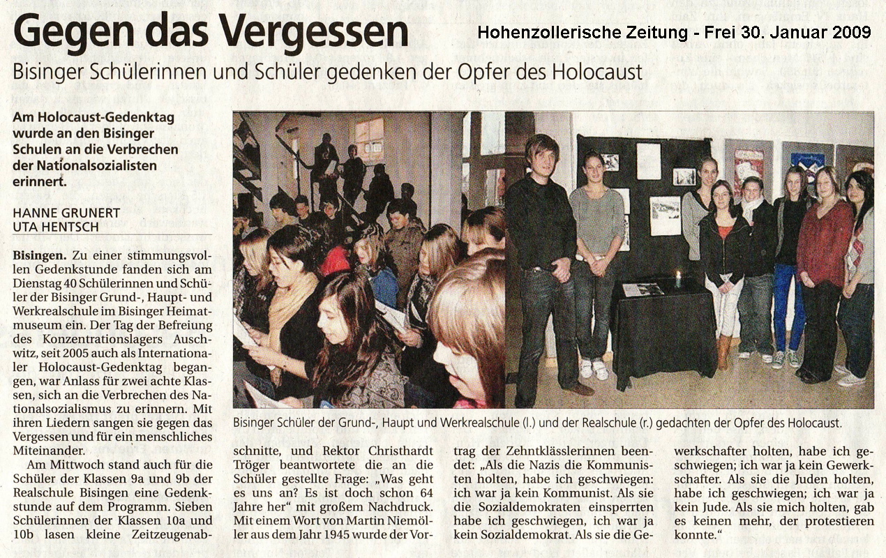 Der 27. Januar ist in 2009 bereits zum dritten Mal für die Bisinger Grund-, Haupt- und WerkRealschule – und Realschule ein Termin mit fester Einplanung für eine Gedenkstunde. Im Folgenden ein kleiner Bericht über die diesjährigen Gestaltungen der Schulen – mit Schülern für Schüler.