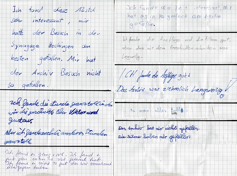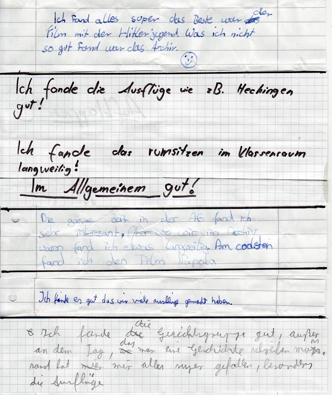 Die Schüler-AG mit 7.Klässlern der Realschule Bisingen endete im Januar 2009 – abschließend bleibt anzumerken, dass es eine reizvolle und durchaus erfreuliche Arbeit war – die 14 Jungens waren sehr gut dabei, zeigten sich interessiert und offen für das Thema (siehe Kategorie 2008 unter:             ) Wir haben ihre eigenen Eindrücke in der letzten Stunde eingesammelt – hier Schüler-Statements -1Schüler-Statements-2nachzulesen (ein Schüler fehlte wegen Krankheit).