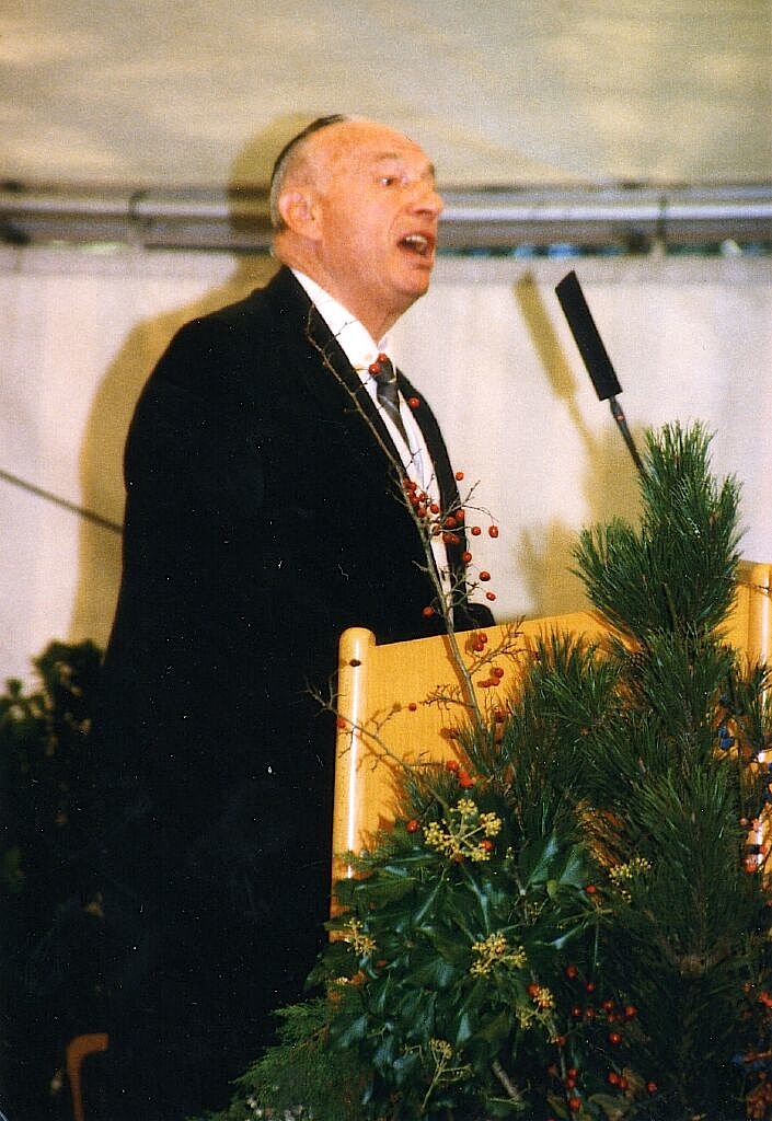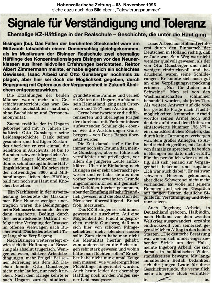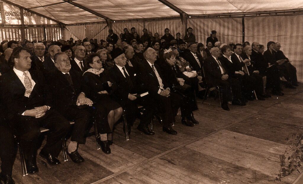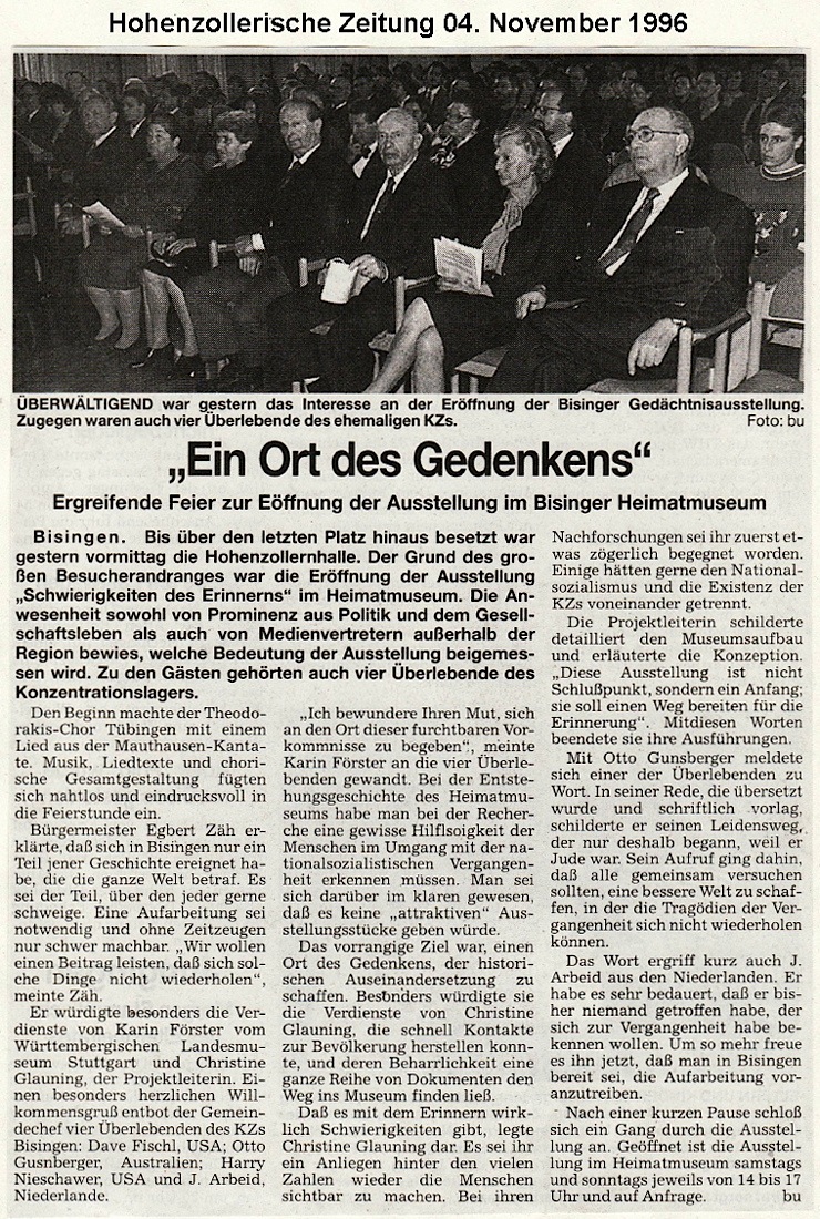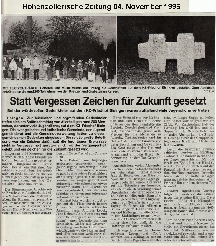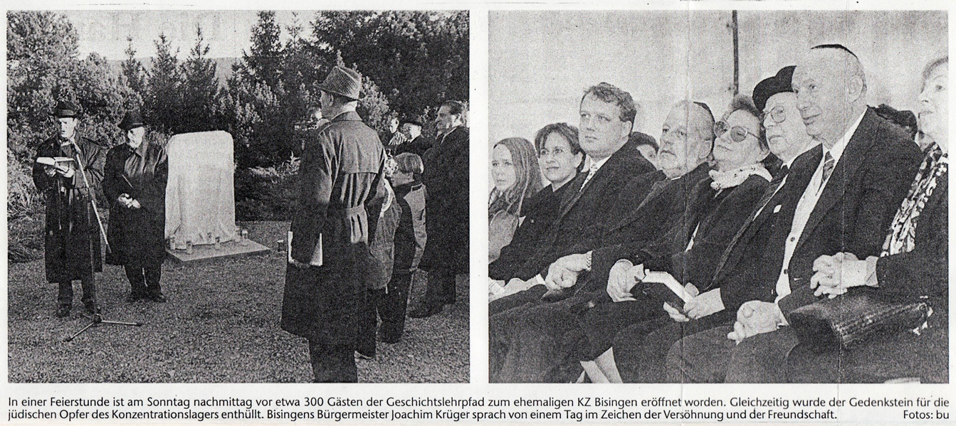 Bisingens Bürgermeister Joachim Krüger sprach von einem Tag im Zeichen der Versöhnung und der Freundschaft. Rückblickend erinnerte er an das Grauen von Millionen verfolgter und getöteter Menschen, wobei das KZ Bisingen den großen Vernichtungslagern in nichts nachgestanden habe. Man habe schon vor einer Reihe von Jahren begonnen, sich an die unseligen Vorkommnisse zu erinnern, was nicht überall auf Verständnis und Zustimmung gestoßen sei. Es ergebe sich aus der Geschichte heraus eine besondere Verantwortung und Pflicht. Heute und in Zukunft gelte es, die Erinnerung an das geschehene Unrecht wachzuhalten und alles dafür zu tun, daß Gleiches nicht mehr geschehe. Die Überlebenden würden er heute als Freunde herzlich aufgenommen: „Wir reichen ihnen die Hand“.