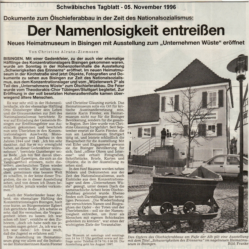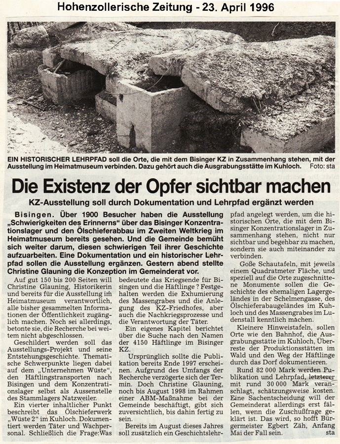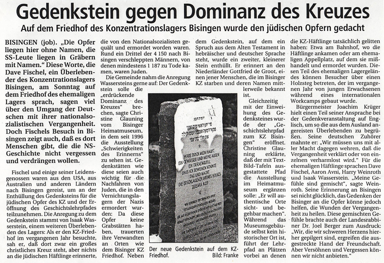 Bisingen (bu). In einer Feierstunde am Sonntag nachmittag vor 300 Gästen ist der Geschichtslehrpfad zum ehemaligen KZ Bisingen eröffnet worden. Gleichzeitig wurde der Gedenkstein für die jüdischen Opfer des Konzentrationslagers enthüllt.