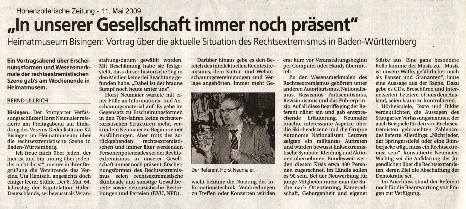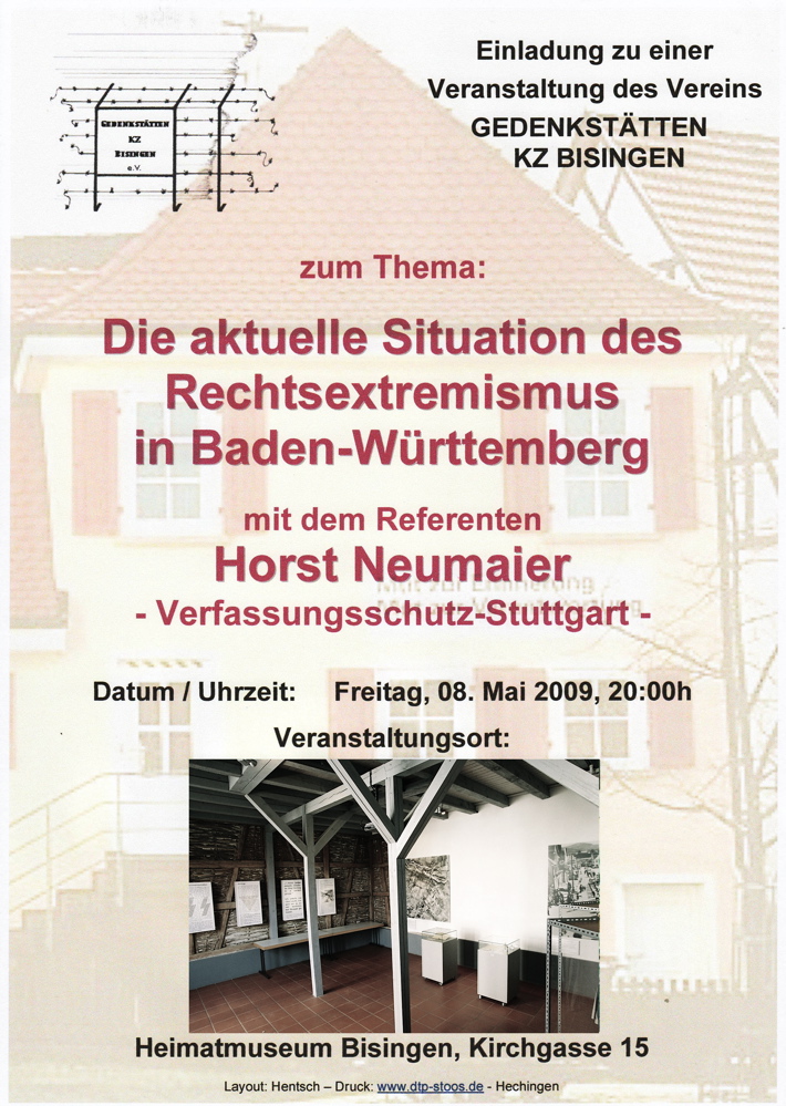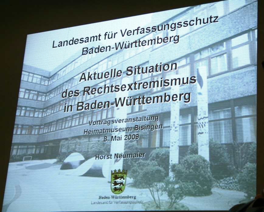 Die Ausführungen Neumaiers waren umfangreich und beinhalteten die neuesten Zahlen über rechtsextremistische Umtriebe in BW. Im Folgenden sollen zwei Zeitungsberichte einen Eindruck über diesen Abend vermitteln: