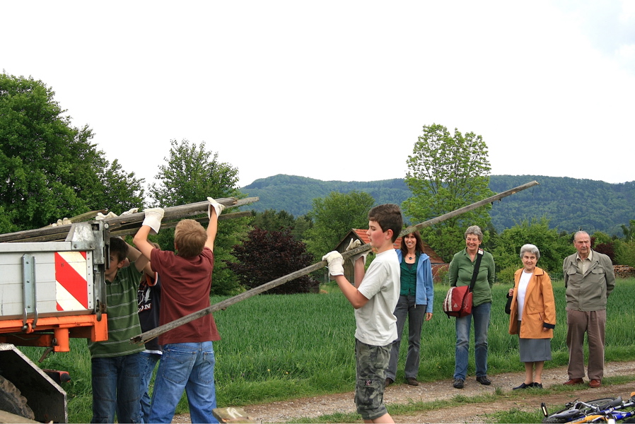 Bei meinem Eintreffen vor Ort um 14:45h zeigte sich der Steg bereits als ein Gerippe, aus dem hunderte stark verrosteter Nägeln ragten. Die erste Fuhre mit Brettern wurde gerade weggefahren – die Buben stapelten gemähtes Gras mit so mancherlei jugendlicher Ausgelassenheit zu großen Haufen. Herr Huesfeld ermahnte gelegentlich sehr ruhig aber bestimmt zur Vorsicht im Umgang mit den Heugabeln, ohne die vergnügliche Atmosphäre der jugendlichen Hilfskräfte aufzuheben.