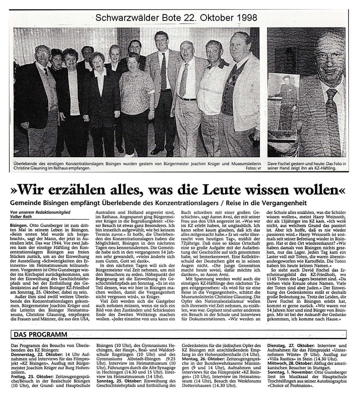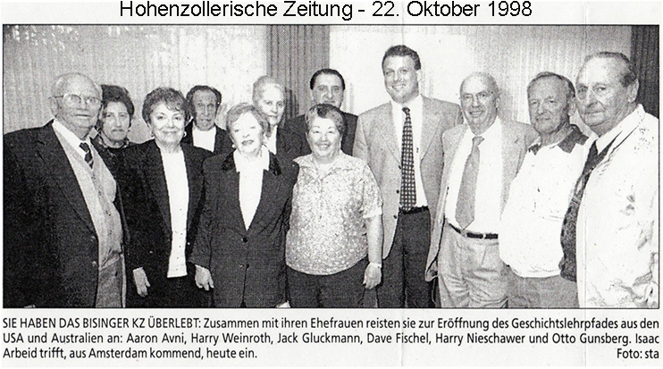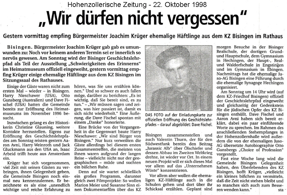Einundfünfzig Jahre später steht er wieder am Ort seines Leidens. „Ich bin sehr dankbar, dass Sie es mir ermöglicht haben, an dieser Gedenkfeier teilzunehmen“ sagte Otto Gunsberger im November 1996 (Anmerkung: siehe auch „Kategorie 1996“), der mit drei weiteren Überlebenden des KZ Bisingen auf Einladung der Gemeinde zur Eröffnung der Ausstellung „Schwierigkeiten des Erinnerns“ gekommen war.