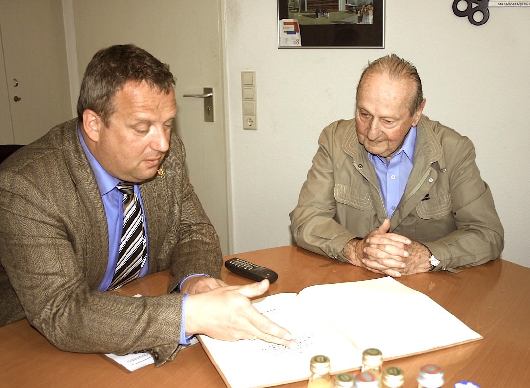 Auch Bürgermeister Krüger nahm sich gerne Zeit für seine Gäste und hatte ein offenes Ohr für ein Anliegen Otto Gunsbergers. Für das Gräberfeld auf dem KZ-Friedhof wünscht er sich zwischen den Kreuzen jüdische Grabsteine, denn über ein Drittel der Opfer des KZ Bisingen waren Juden. Bei der Zusammenkunft im Rathaus konnte der Verein KZ Gedenkstätten Bisingen den Gästen einen Reisekostenzuschuss überreichen, den sie bei der Berliner Stiftung „Erinnerung, Verantwortung, Zukunft“ beantragt hatten. Diese Stiftung leistet wertvolle Erinnerungsarbeit und unterstützt unter anderem Begegnungen junger Menschen mit Opfern der NS-Diktatur.