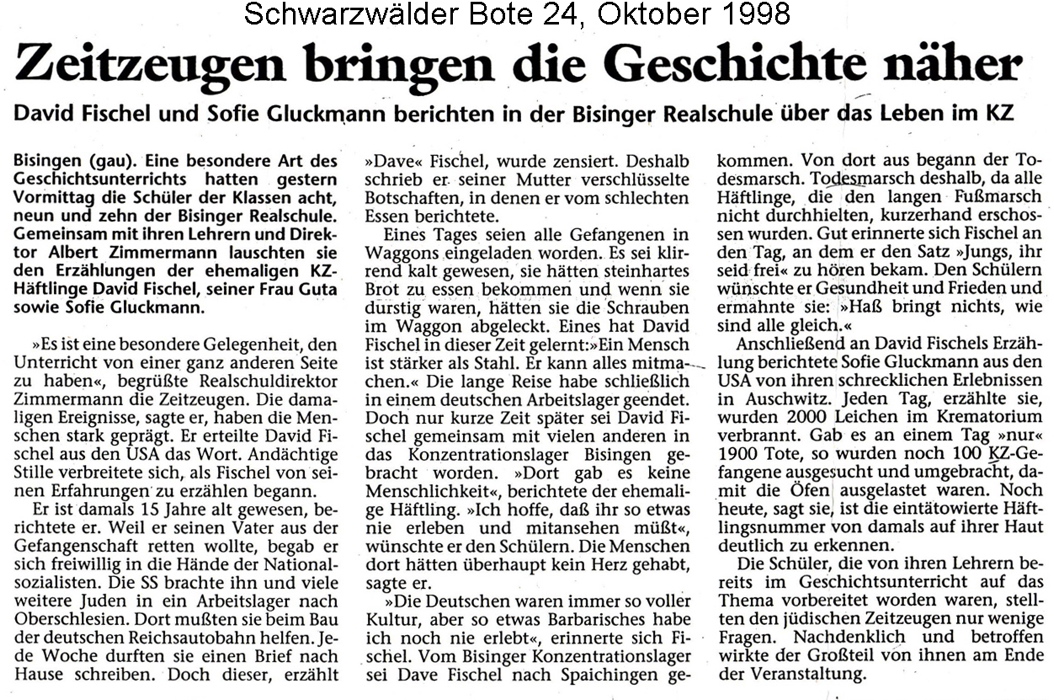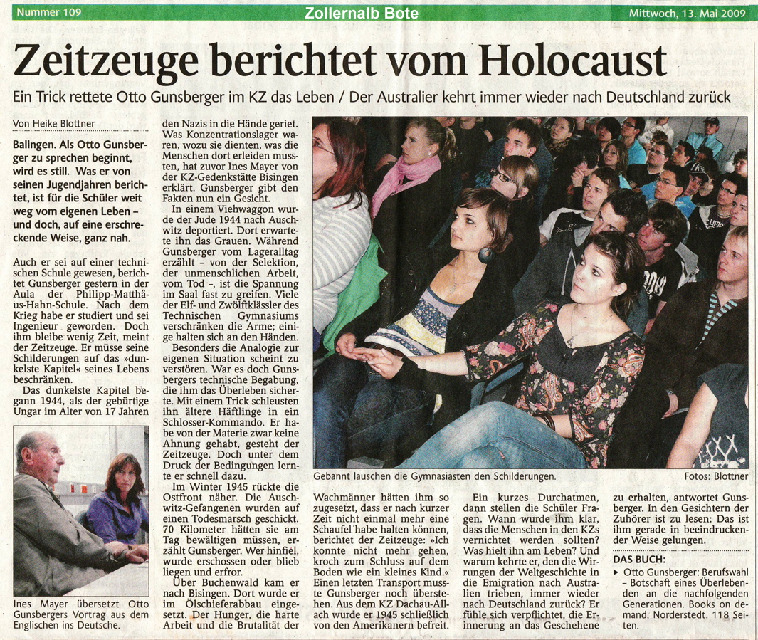 Hier im Anschluss noch ein Pressebericht des Zollernalb Bote vom 13, Mai 2009 über den Zeitzeugenbericht im Technischen Gymnasium Balingen am 12. Mai 2009
