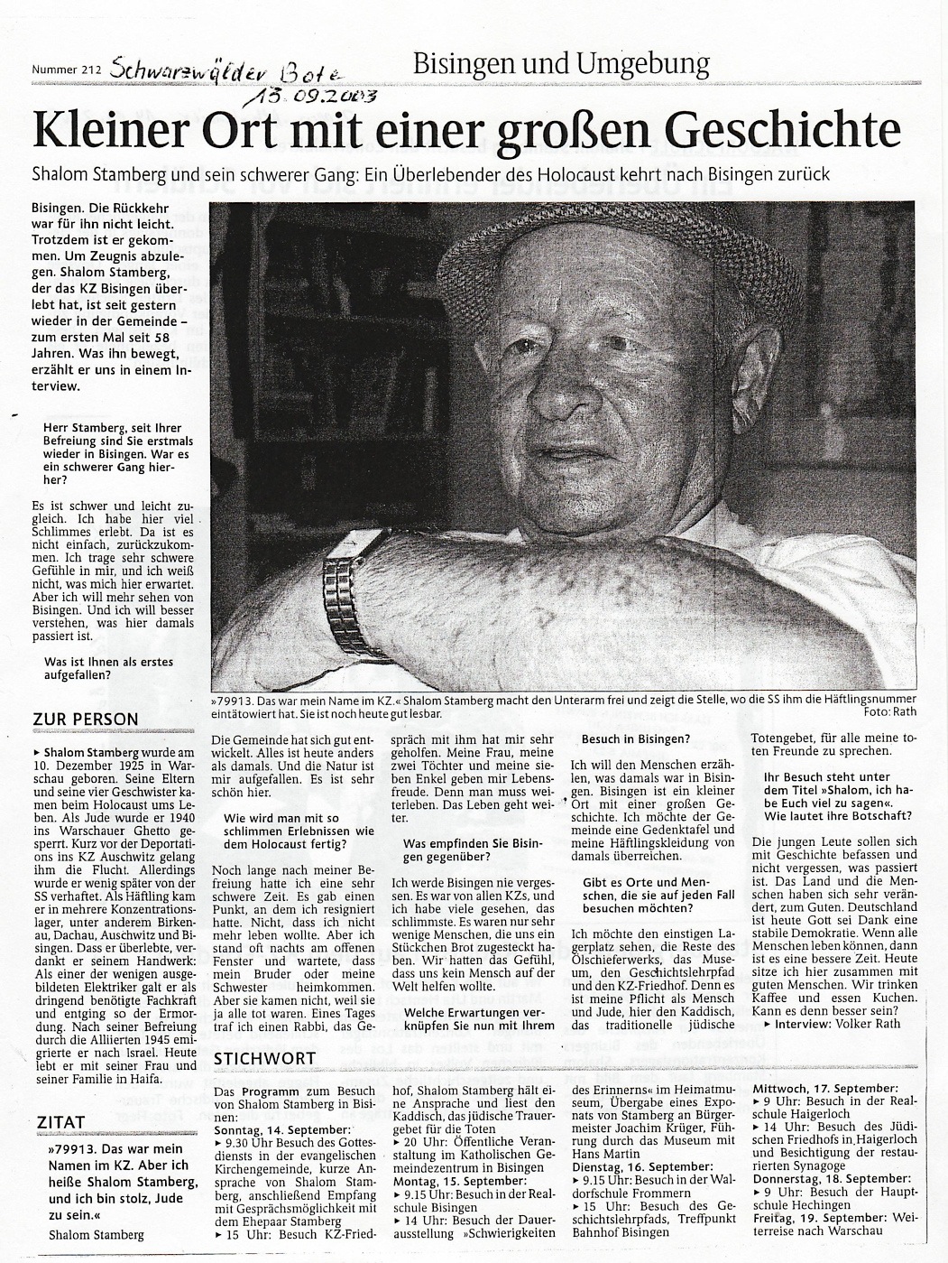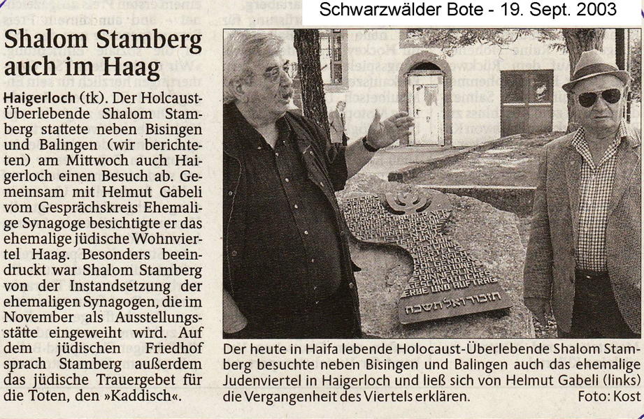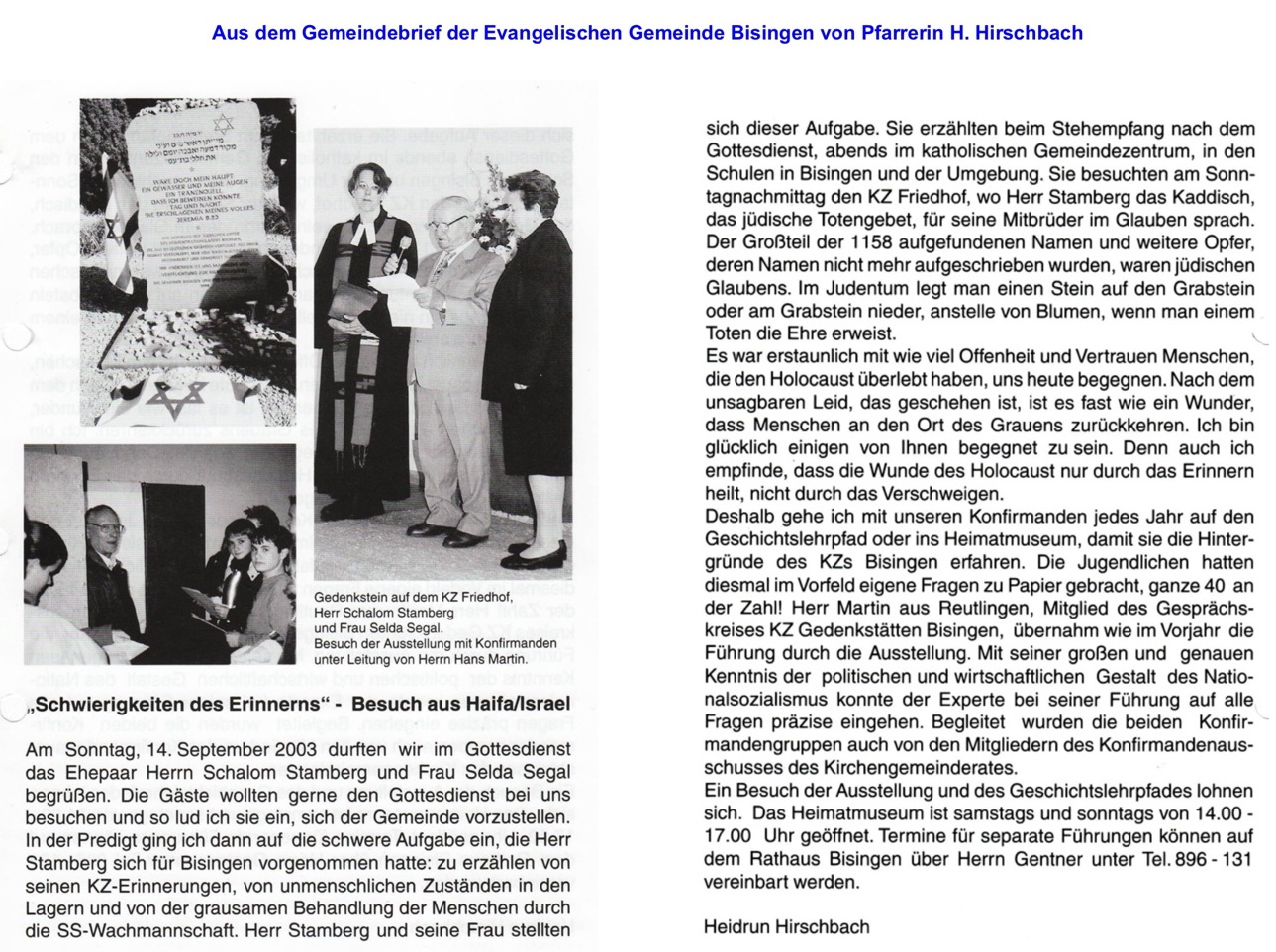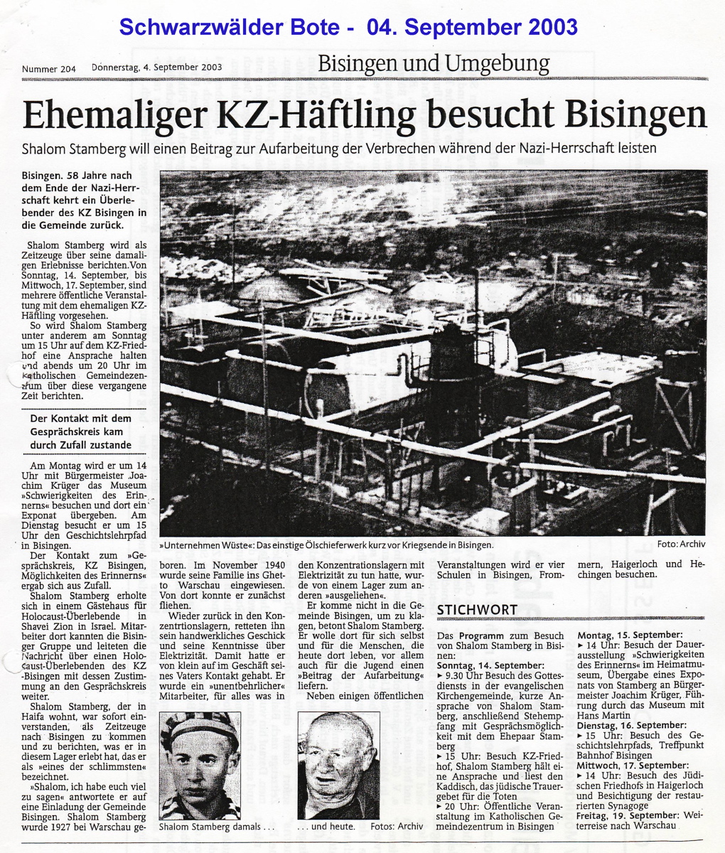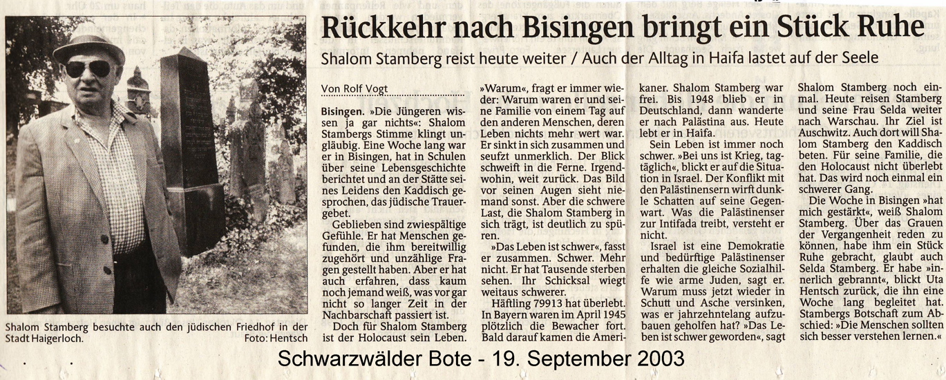 Sitzung am 22. Mai 2003 – mit dem Hauptthema “Shalom und Selda Stamberg in Bisingen” . Bürgermeister Krüger teilte uns mit, dass die Kosten für den Aufenthalt von Stambergs von der Gemeinde übernommen werden. Termin eine Woche vom 12. – 19. September 2003. Feinplanungen wurden für die nächste Sitzung im Juli aufgehoben. Für den Besuch in 5 Schulen (2 in Bisingen / 3 in der Region) stellten sich aus der Gruppe des Gesprächskreises Mitarbeiter für die Kontaktaufnahme mit den Schulen zur Verfügung. Eine öffentliche Veranstaltung mit Shalom Stamberg unter dem Titel “Schalom – ich habe Euch viel zu erzählen” wurde für den 14. 09. 2003 mit einer Führung durchs Heimatmuseum “vor”geplant.
