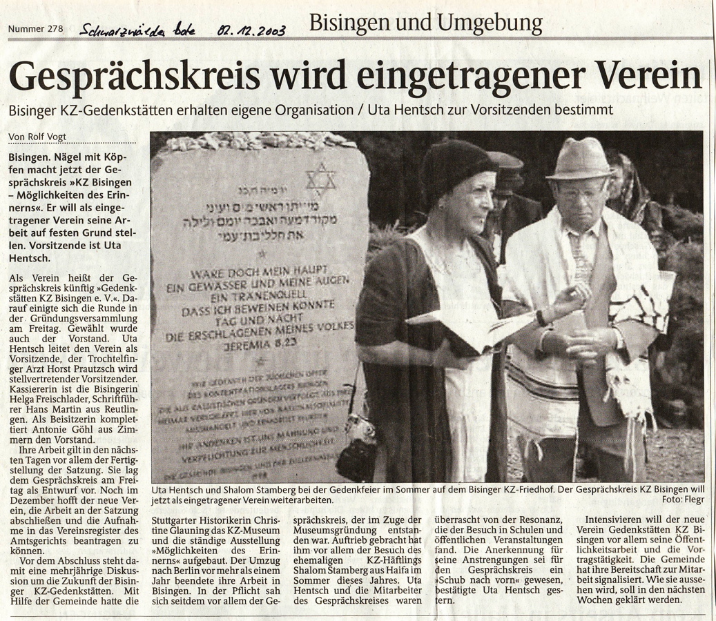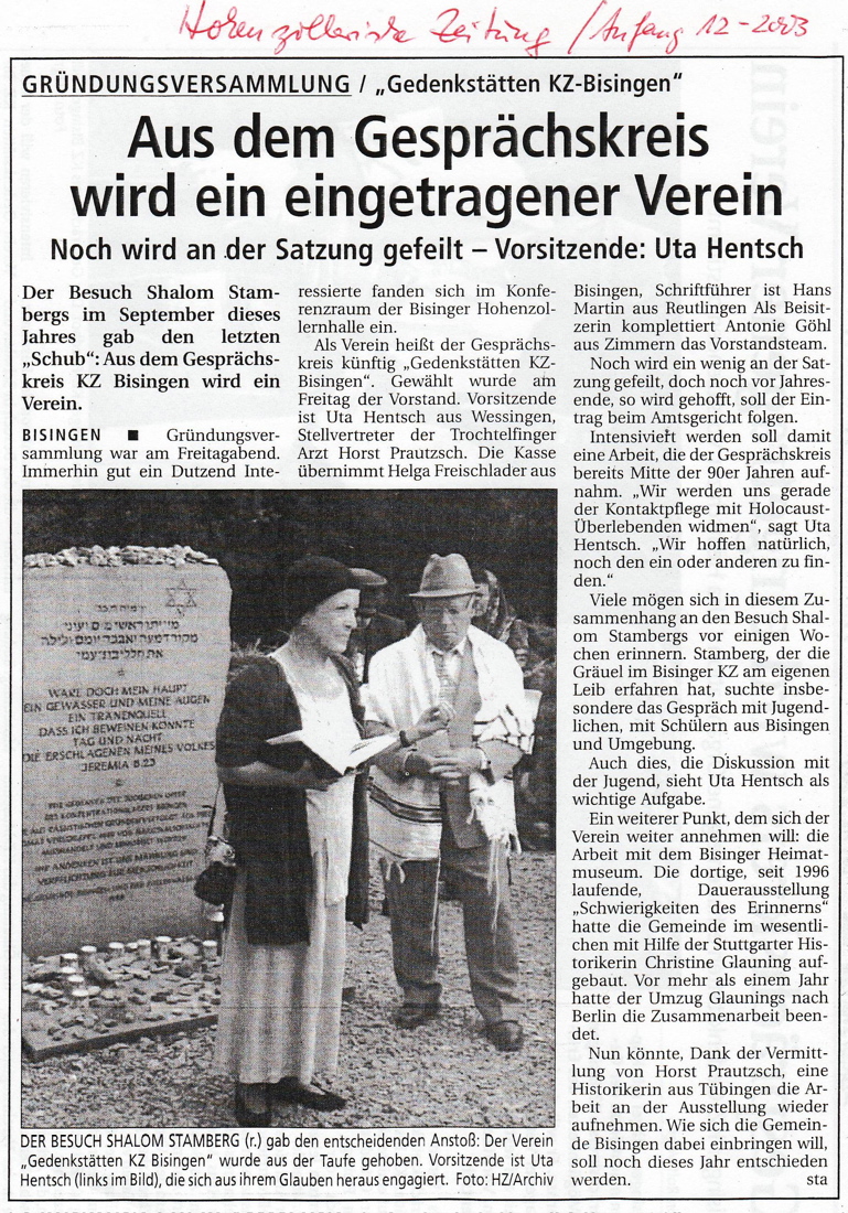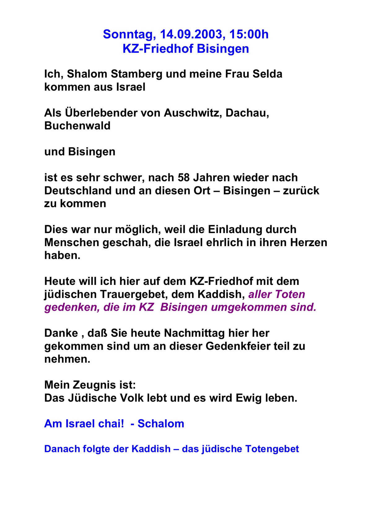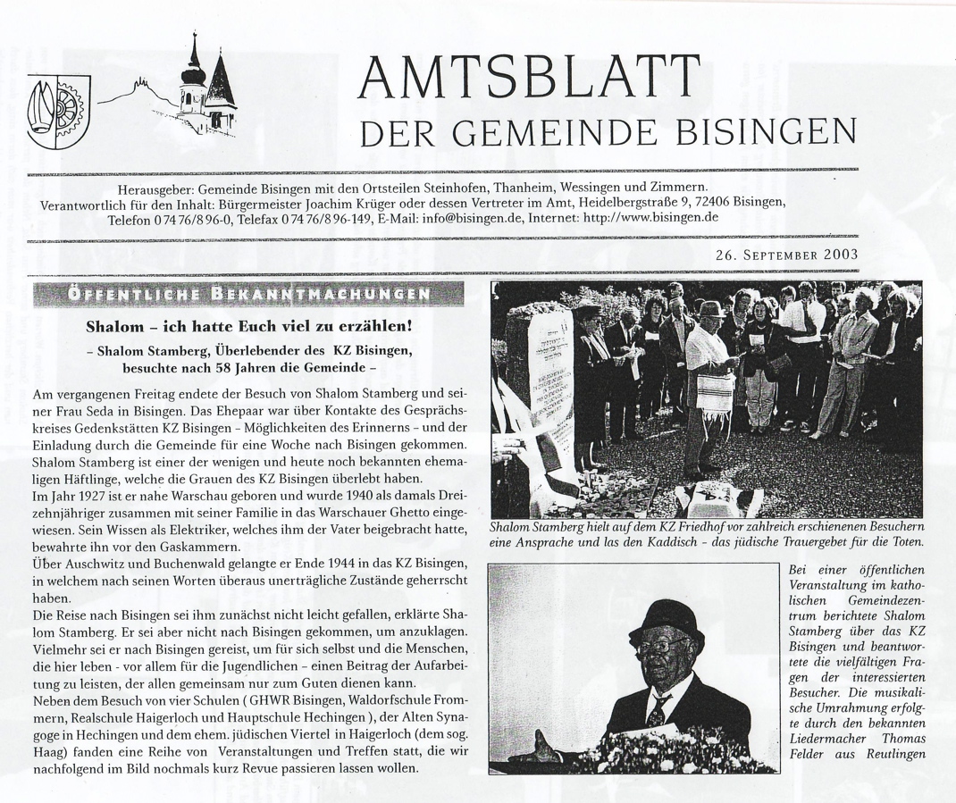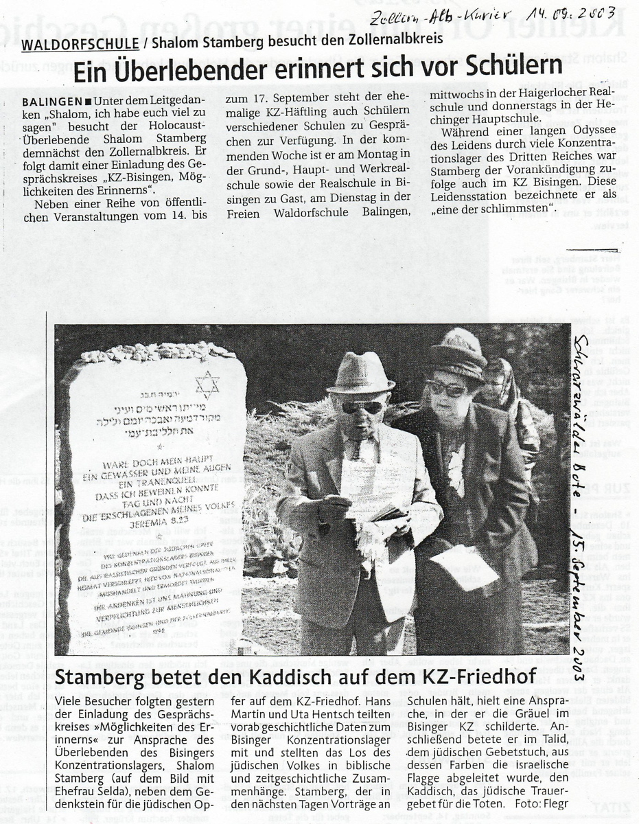Sitzung am 22. Mai 2003 – mit dem Hauptthema “Shalom und Selda Stamberg in Bisingen” . Bürgermeister Krüger teilte uns mit, dass die Kosten für den Aufenthalt von Stambergs von der Gemeinde übernommen werden. Termin eine Woche vom 12. – 19. September 2003. Feinplanungen wurden für die nächste Sitzung im Juli aufgehoben. Für den Besuch in 5 Schulen (2 in Bisingen / 3 in der Region) stellten sich aus der Gruppe des Gesprächskreises Mitarbeiter für die Kontaktaufnahme mit den Schulen zur Verfügung. Eine öffentliche Veranstaltung mit Shalom Stamberg unter dem Titel “Schalom – ich habe Euch viel zu erzählen” wurde für den 14. 09. 2003 mit einer Führung durchs Heimatmuseum “vor”geplant.