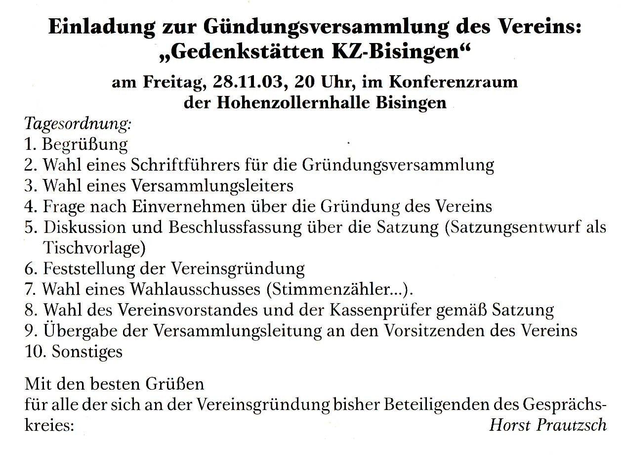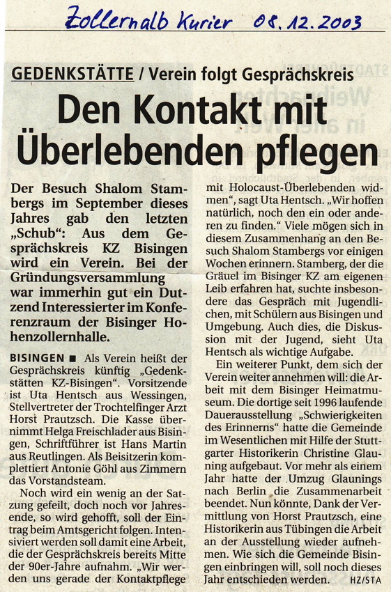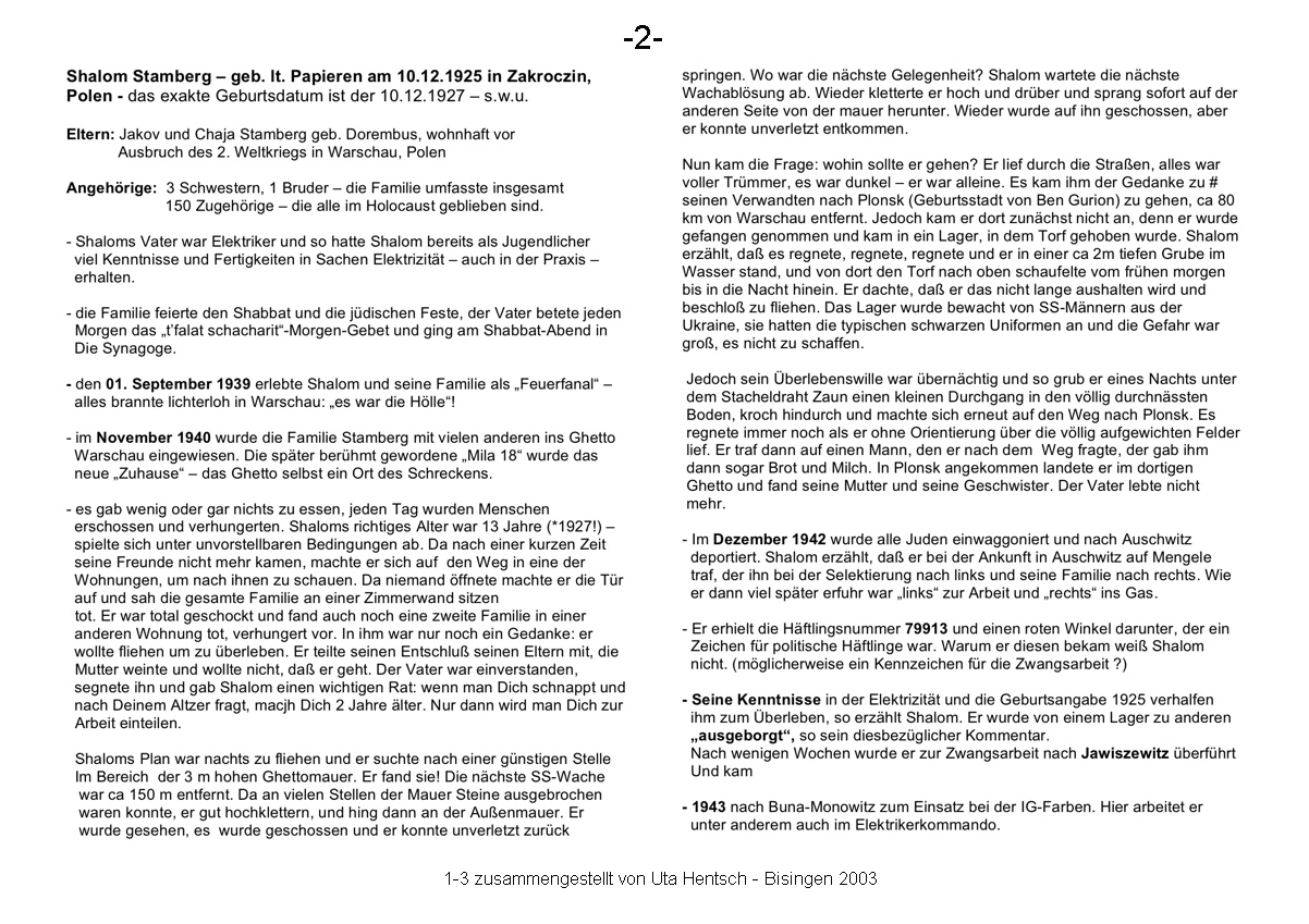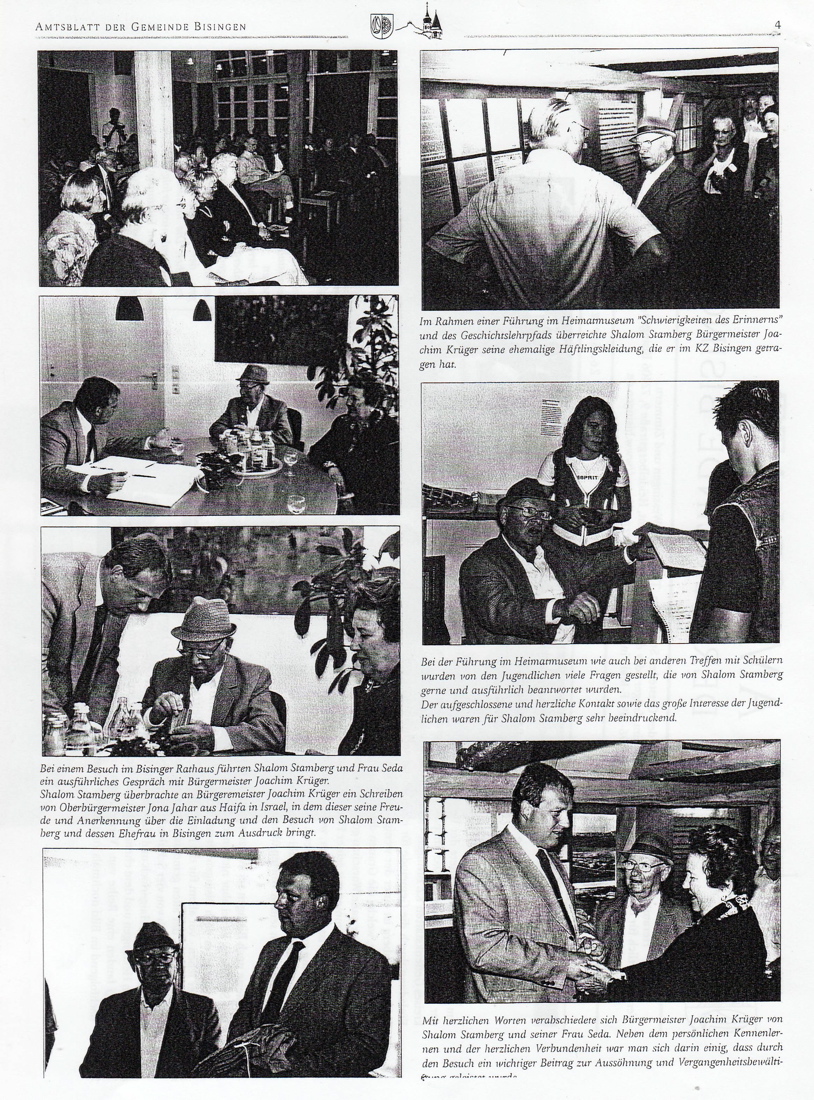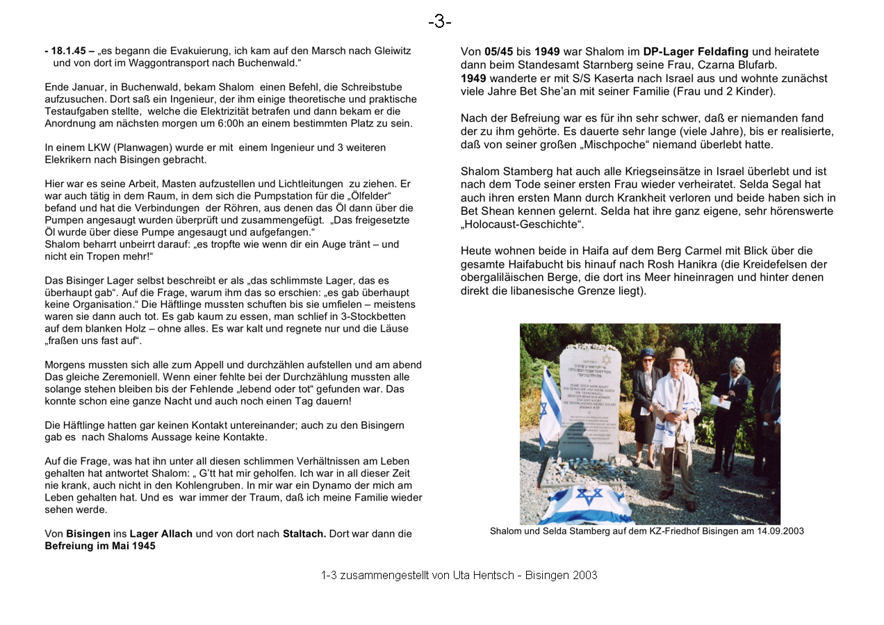 Sitzung am 22. Mai 2003 – mit dem Hauptthema “Shalom und Selda Stamberg in Bisingen” . Bürgermeister Krüger teilte uns mit, dass die Kosten für den Aufenthalt von Stambergs von der Gemeinde übernommen werden. Termin eine Woche vom 12. – 19. September 2003. Feinplanungen wurden für die nächste Sitzung im Juli aufgehoben. Für den Besuch in 5 Schulen (2 in Bisingen / 3 in der Region) stellten sich aus der Gruppe des Gesprächskreises Mitarbeiter für die Kontaktaufnahme mit den Schulen zur Verfügung. Eine öffentliche Veranstaltung mit Shalom Stamberg unter dem Titel “Schalom – ich habe Euch viel zu erzählen” wurde für den 14. 09. 2003 mit einer Führung durchs Heimatmuseum “vor”geplant.