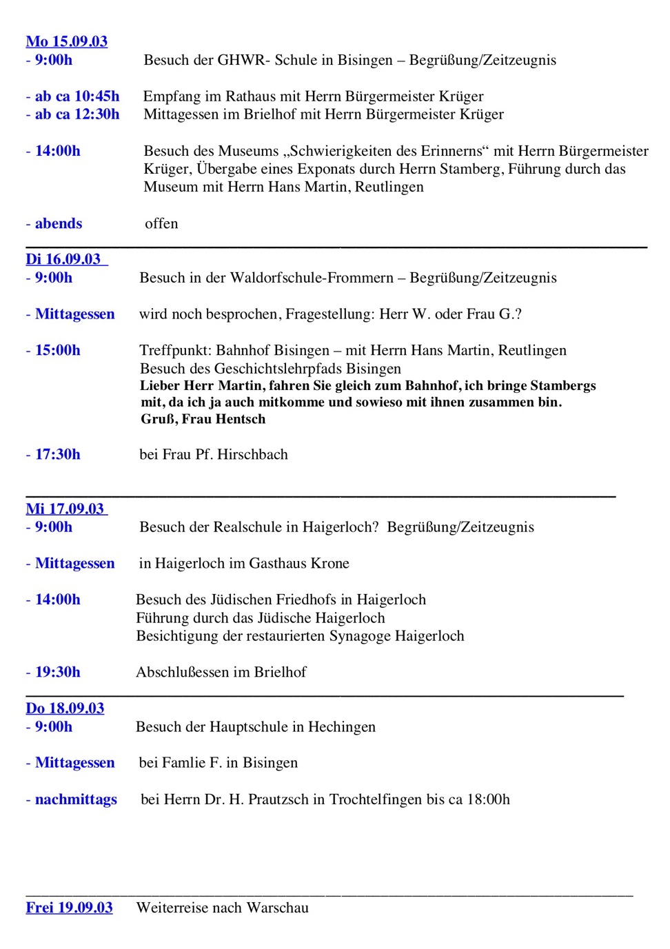 Sitzung am Mittwoch 02. April 2003 – bei diesem Treffen begannen die Vorplanungen für den Besuch der Gäste aus Israel. Mir wurde die Aufgabe übertragen, den Zeitpunkt des Besuchs, die Frage nach koscheren Mahlzeiten und evtl. Schulbesuchen mit Stambergs zu klären, sowie Flug und Hotelkosten u.v.a.m. in Erfahrung zu bringen. Wir sprachen über eine öffentliche Veranstaltung und Begleitung durch Mitglieder des Gesprächskreises der Familie Stamberg während ihres Aufenthaltes in Bisingen. Bürgermeister Krüger sollte nach Einholung aller Fakten über Kosten, die auf die Gemeinde zukommen würden informiert werden.