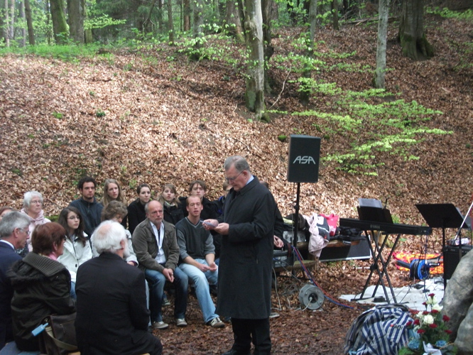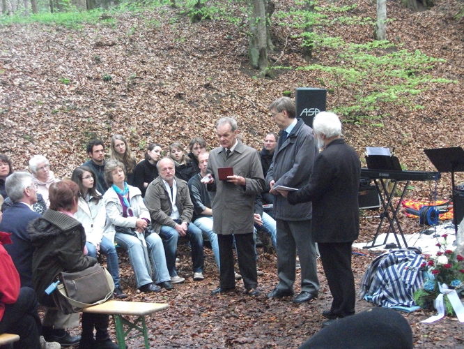 Auch der Schömberger Bürgermeister Karl-Josef Sprenger führte aus (Anmerkg. Rede zum downladen hier: Grußwort – 25 Jahre Gedenkfeiern im Eckerwald), dass es für ein friedliches Miteinander eigentlich nur das simple Motto „was du nicht willst, das man dir tu, das füg auch keinem anderen zu“ brauche. Die Menschen sollten sich verpflichten angesichts solcher Gedenkstätten die Werte des Friedens, der Menschenrechte und der Gewaltfreiheit in die Gegenwart und die Zukunft zu tragen – dann habe die „Initiative Eckerwald“ ihren Sinn. Dem schloss sich auch Gerhard Lempp an, der die Initiative federführend leitet und schloss die Veranstaltung mit den Worten, dass der Eckerwald zu einer kleinen und bescheidenen Insel der Versöhnung geworden sei. Und diese Versöhnung bedeute Befreiung.