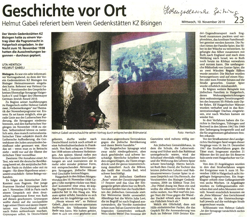 Zu einem Vortrag zum Thema: der Novemberpogrom in Haigerloch in der Nacht vom 09. zum 10. November 1938, hatte der Verein Gedenkstätten KZ Bisingen eingeladen. Neunzehn Besucher erhielten umfangreiche Einblicke in geschichtliche, „nach“-juristische und Haigerloch speziell betreffende Fakten um die Geschehnisse der als „Reichspogromnacht“ bekannten Übergriffe deutscher Nazi-Schergen gegen persönliches Eigentum, Synagogen und Schulen von jüdischen Bürgern im Nazi-Deutschland. Es wurde ein sehr informativer Abend, die Ausführungen von Helmut Gabeli wurden durch entsprechendes Bildmaterial unterstützt.