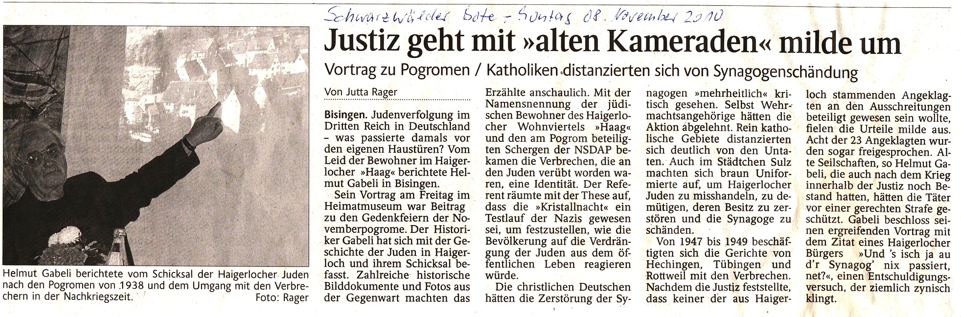 Zu Beginn seiner Ausführungen zu Haigerloch stellte Helmut Gabeli zwei „Vorbemerkungen“ zur Thematik der Novemberpogrome vor. Erstens zusammenfassend: (…..) Es ist daher kaum möglich, eine gerade Linie aus der Lutherschen Forderung, die Synagogen niederzubrennen, und den barbarischen Vorgängen im November 1938 zu ziehen. Selbstredend kann es natürlich sein, dass manch nationalsozialistischer Täter subjektiv durch die Luther’sche Aufforderung, die Gotteshäuser der Juden anzuzünden beeinflusst oder gesteuert war. Aber das ist – wenn man es in Betracht zieht – wohl nur auf der Ebene der örtlichen Täter vorstellbar. Zweitens: Die Annahme einer Art Test, wie weit die deutsche Bevölkerung bereit sei, die antijüdische Politik der Nazis zu dulden oder mit zu tragen – für diese Hypothese sind – soweit ersichtlich – keine Belege vorhanden.