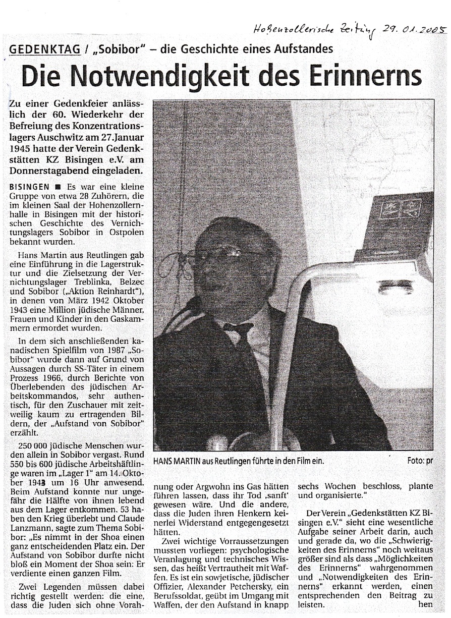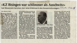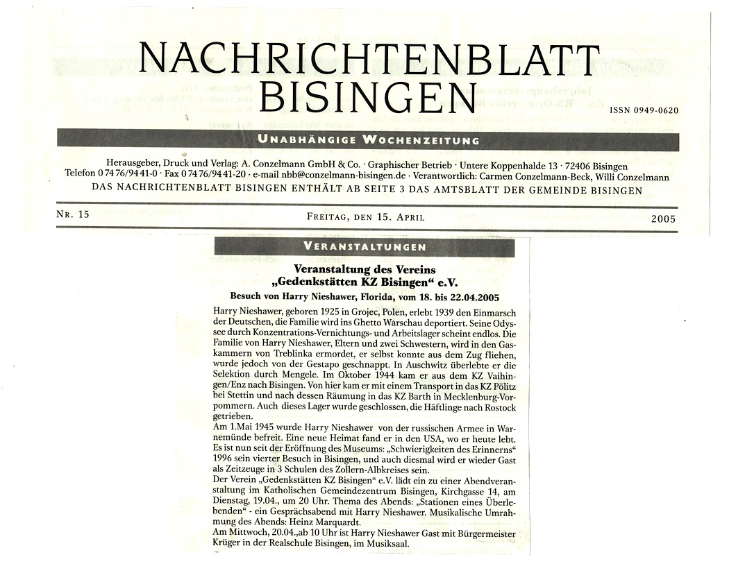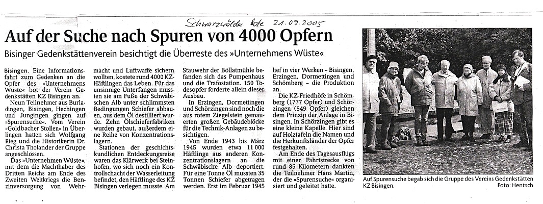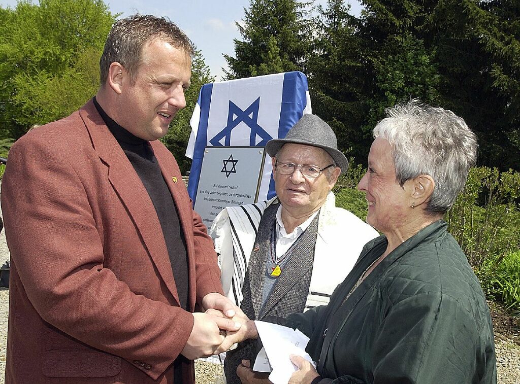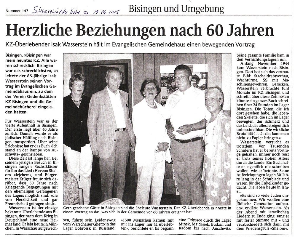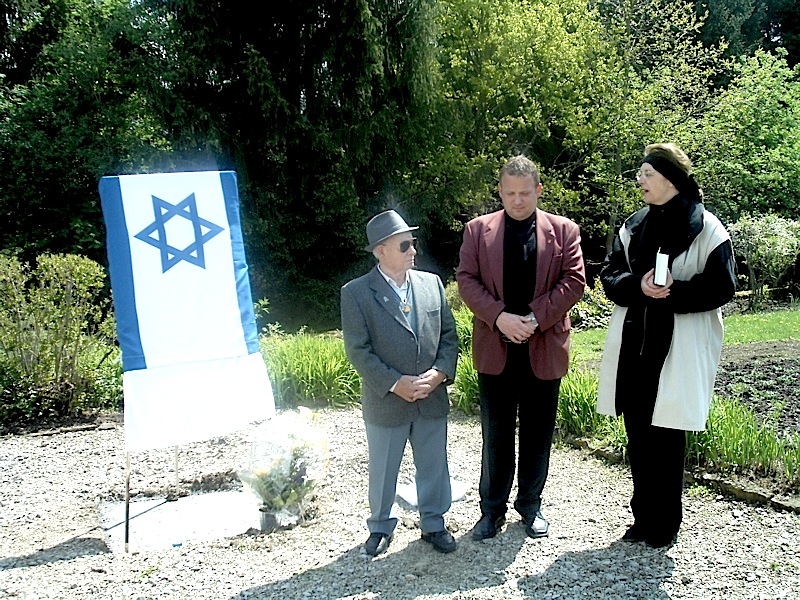 „Es war eine Eingebung von oben, ich musste es tun zum 60. Jahrestag der Befreiung aller Konzentrationslager am 10. Mai 1945 und nichts konnte mich davon abhalten“ – so Shalom Stamberg am 10. Mai 2005 am frühen Nachmittag auf dem KZ-Friedhof Bisingen. Es war eine denkwürdige Veranstaltung – durch die Kreativität von Mitgliedern des Vereins Gedenkstätten KZ Bisingen und die Anwesenheit von Bürgermeister Krüger und Pfarrerin Hirschbach, einer Gruppe von Freunden des Vereins und einer Schulklasse erhielt die symbolische Enthüllung der Gedenktafel einen würdigen Rahmen – Shalom Stamberg, Überlebender des KZ Bisingen, sprach allen Anwesenden einen großen Dank aus.