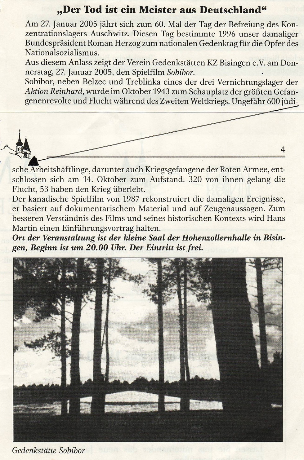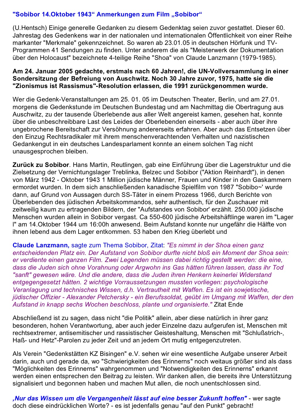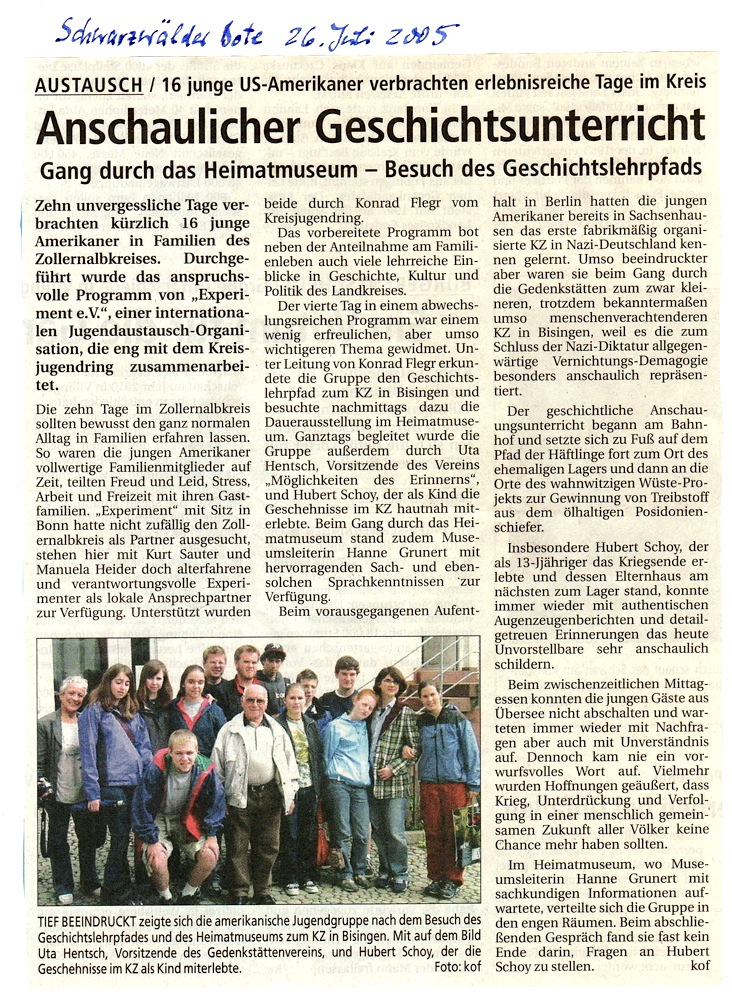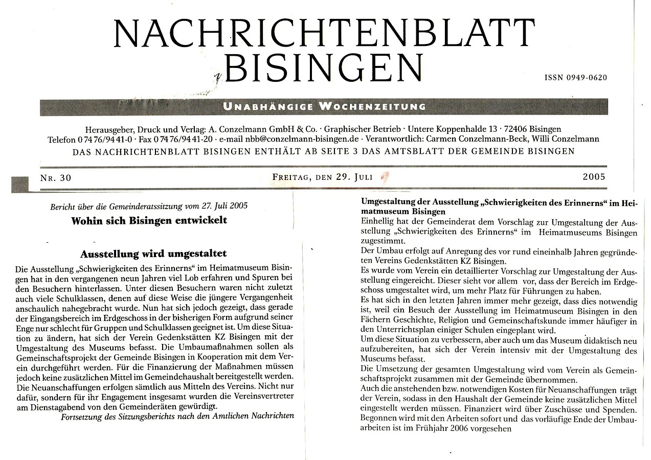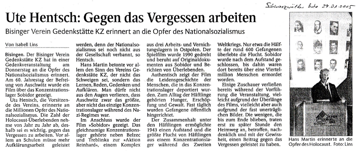 „Es war eine Eingebung von oben, ich musste es tun zum 60. Jahrestag der Befreiung aller Konzentrationslager am 10. Mai 1945 und nichts konnte mich davon abhalten“ – so Shalom Stamberg am 10. Mai 2005 am frühen Nachmittag auf dem KZ-Friedhof Bisingen. Es war eine denkwürdige Veranstaltung – durch die Kreativität von Mitgliedern des Vereins Gedenkstätten KZ Bisingen und die Anwesenheit von Bürgermeister Krüger und Pfarrerin Hirschbach, einer Gruppe von Freunden des Vereins und einer Schulklasse erhielt die symbolische Enthüllung der Gedenktafel einen würdigen Rahmen – Shalom Stamberg, Überlebender des KZ Bisingen, sprach allen Anwesenden einen großen Dank aus.