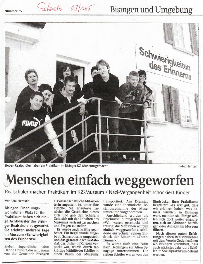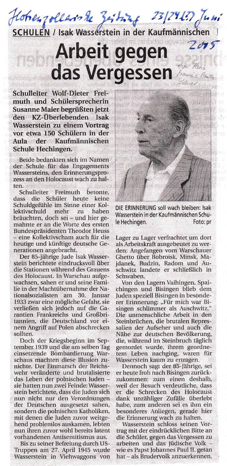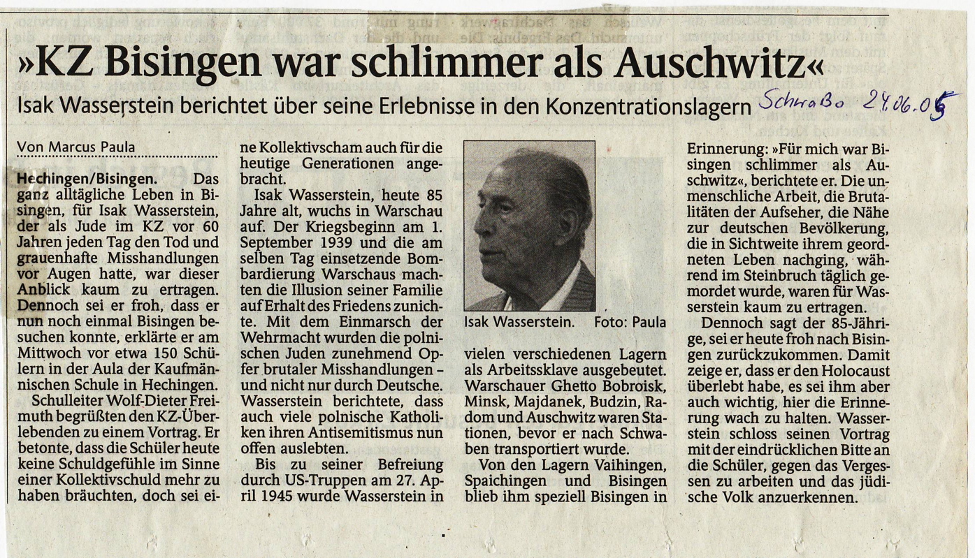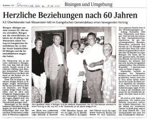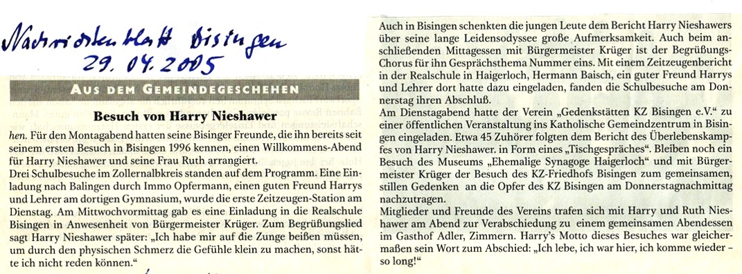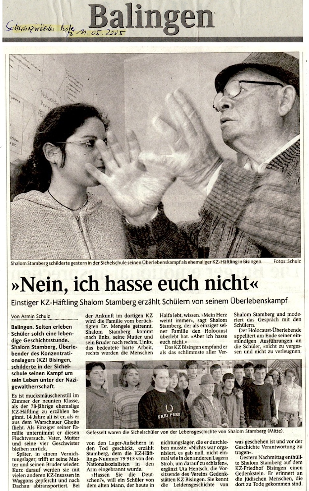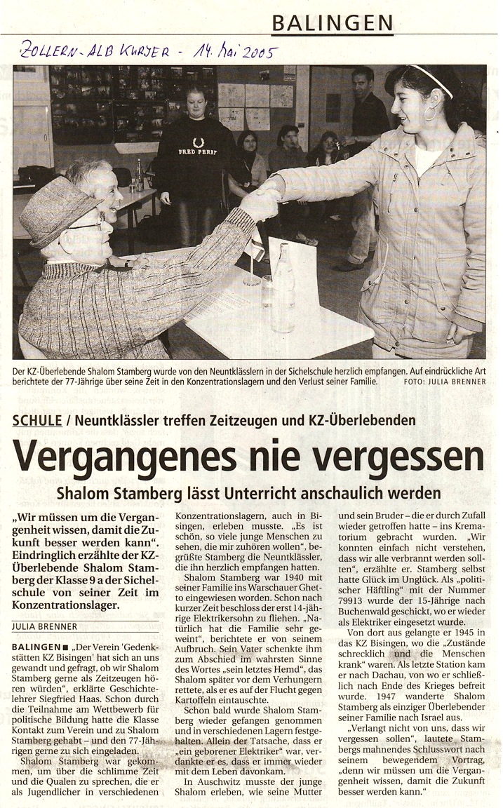 Am Montag, 09. Mai besuchte Shalom Stamberg die HGW-und Realschule in Bisingen und am Dienstag Vormittag war Shalom Stamberg als Zeitzeuge Gast in der Sichelschule Balingen. Im Folgenden Zeitungsberichte und Bilder dieses Nachmittags am 10. Mai 2010