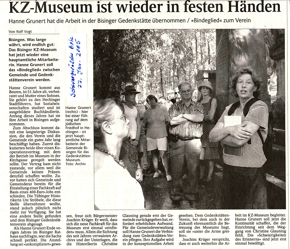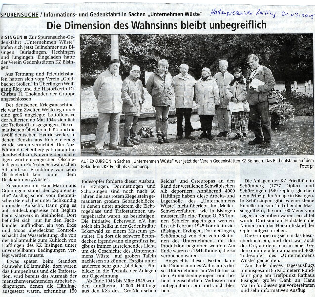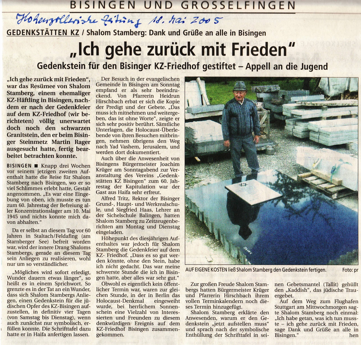 Ein zweiter Höhepunkt in 2005: der zweite Besuch von Shalom Stamberg aus Haifa. Bereits bei einem Besuch der Familie Stanberg im Frühjahr 2004 hatte Shalom Stamberg den Wunsch geäußert, einen Gedenkstein auf dem KT-Friedhof Bisingen zu setzen. In der zweiten Aprilwoche 2005 erfolgte ein Anruf aus Israel – Shalom Stamberg meldete sich an für die Zeit von Freitag 06. – Mittwoch 11. Mai. Er wollte eine Tafel mitbringen, die dann auf einem Gedenkstein angebracht und als Pendant zum jüdischen Gedenkstein von 1998 aufgestellt werden sollte.