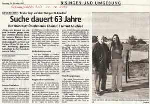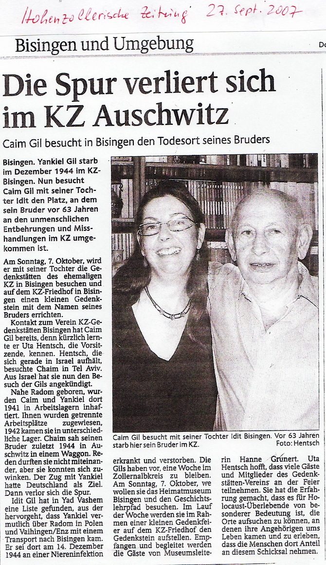 Der Bruder des im Dezember 1944 im KZ Bisingen umgekommenen Yankiel Gil, Chaim Gil, wird am Sonntag, den 7. Oktober um 15.00 Uhr mit seiner Tochter Dr. Idit Gil die Gedenkstätte KZ Bisingen besuchen und möchte auf dem KZ-Friedhof Bisingen einen kleinen Gedenkstein mit dem Namen seines Bruders setzen.