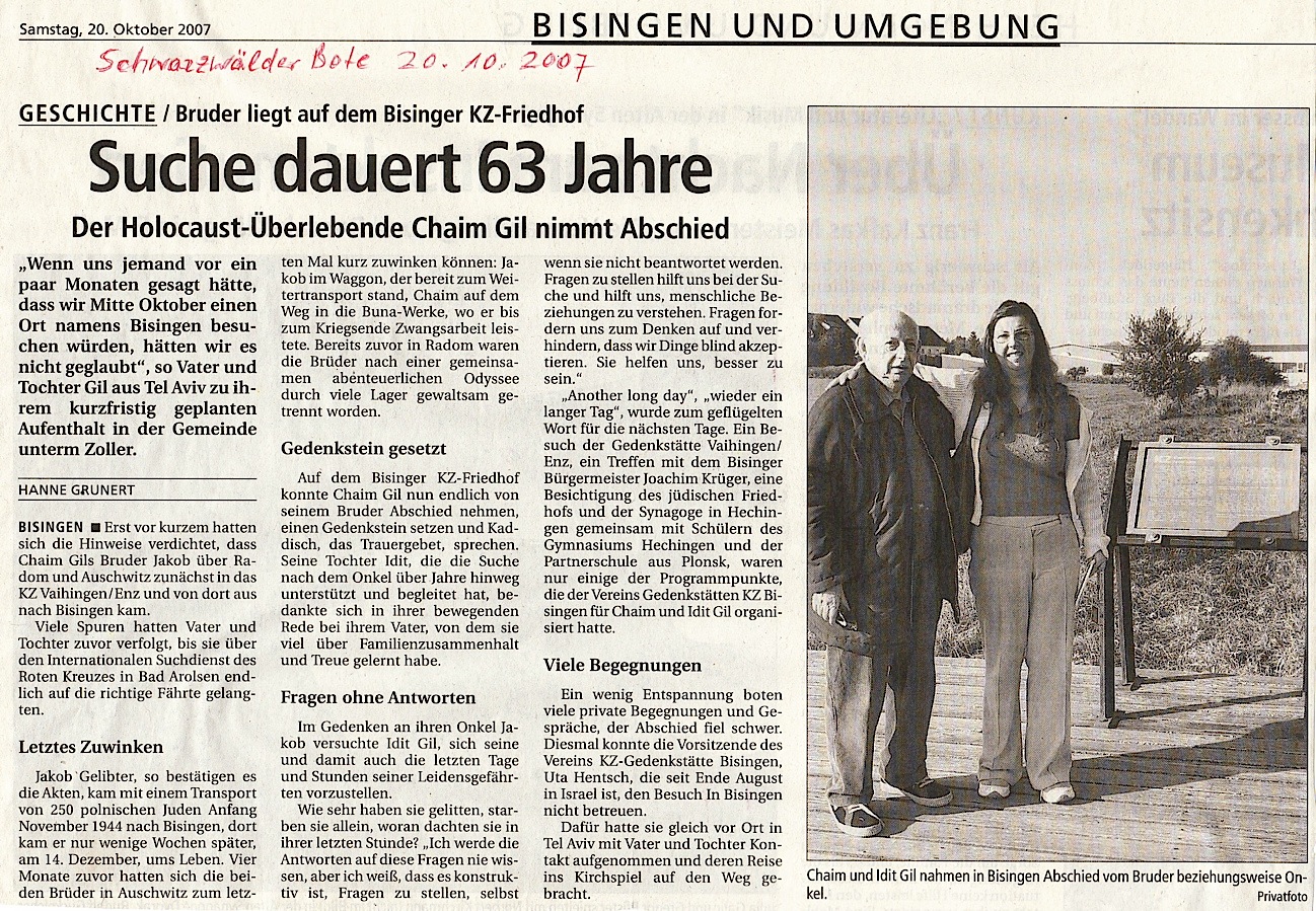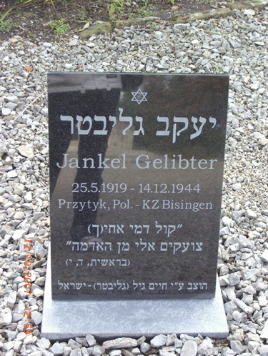 Diese Nachricht erreicht mich in Shavei Zion, Israel, während meiner neunwöchigen Volontariats- und Besuchsreise. Ich konnte Chaim und Idit Gil in Tel Aviv treffen und habe bereits einige Informationen erhalten. Die Brüder Gelibter (jetzt „Gil“) wurden nahe Radom in Polen geboren, kamen 1941 in das Arbeitslager Radom. Chaim kam 1944 von dort nach Auschwitz , dort trennten sich ihre Wege endgültig und er konnte seinem Bruder nur noch von einem anderen Zug aus zuwinken. Yankiel kam nach Deutschland und gelangte über das KZ Vaihingen/Enz mit einem Transport nach Bisingen. Recherchen der Gils ergaben, dass er hier im Dezember 1944 verstarb.