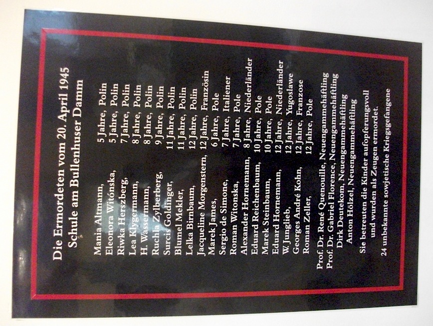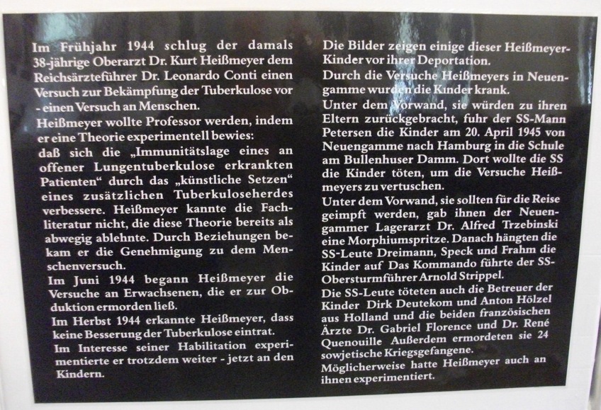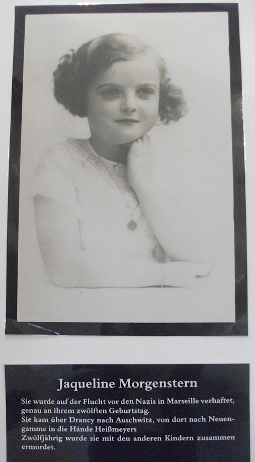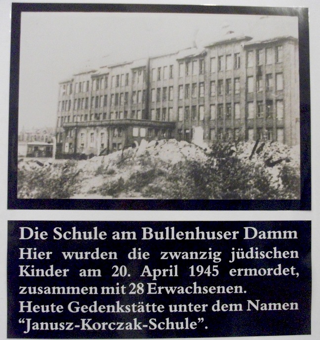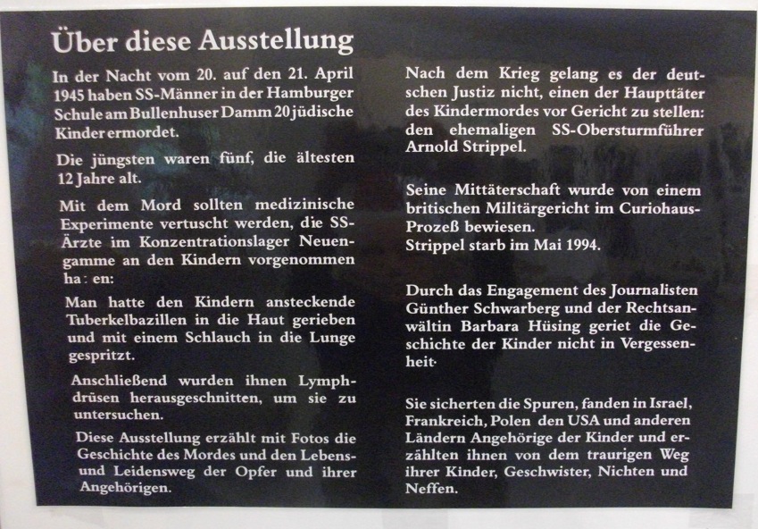 Zunächst der Text vom Flyer zu dieser Ausstellung: Zwanzig Kinder, fünf- bis zwölfjährige Jungen und Mädchen aus ganz Europa, von ihrem Zuhause fortgeschafft, nur weil sie Juden waren, ihren Eltern im Konzentrationslager Auschwitz weggenommen, anschließend für ein halbes Jahr Opfer medizinischer Verusche im Konzentrationslager Neuengamme und zuletzt kurz vor Kriegsende in einer Hamburger Schule von SS-Männern erhängt.