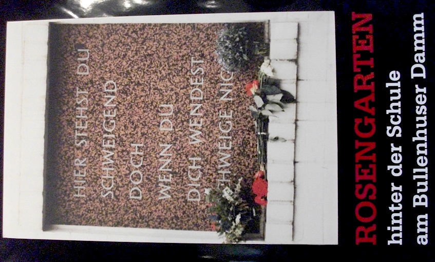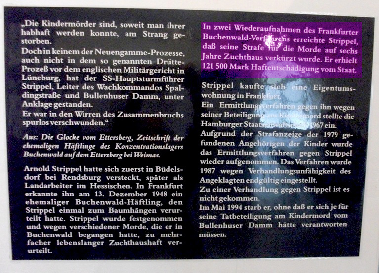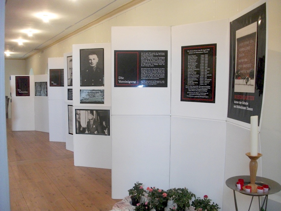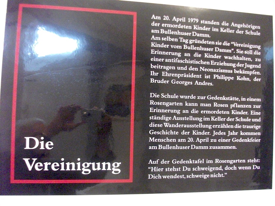 Bild 11 – 14 „Stellwand“ / Text über „Vereinigung Kinder vom Bullenhuser Damm/die Namen der Kinder/der Rosengarten