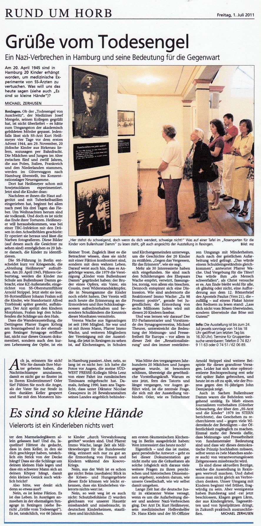 Das Ehepaar Wache, Sigmaringen, hatte am 26. Juni 2011 in der Ehemaligen Synagoge Rexingen eine Wanderausstellung über „Die Kinder vom Bullenhuser Damm“ eröffnet.
