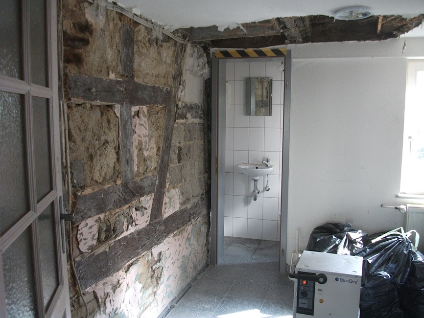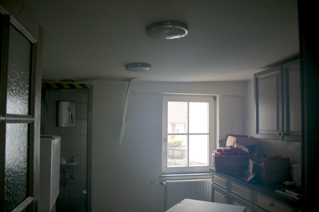 Feuchtigskeitszustand und 2. die Wölbung der Küchendecke nach unten. Küchendecke und eine Wand der Küche müssen wohl bis zur Küchenzeile hin vollständig erneuert werden. Alle technischen Geräte im unteren Raum und Ausstellungsobjekte sind unversehrt geblieben – das ist für uns alle ein Glücksfall. Am Freitag, 24. Februar 2012 waren am Vormittag noch ein die Trockenfirma und Versicherung vor Ort – Ergebnisse sind dem vereins-Vorstand zu diesem Zeitpunkt noch nicht bekannt.