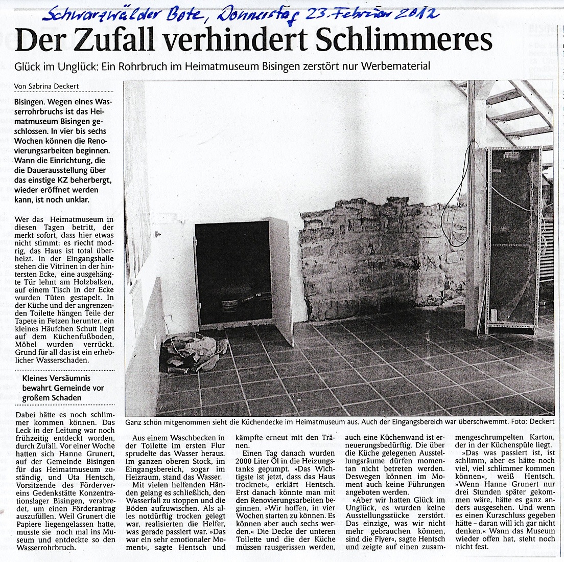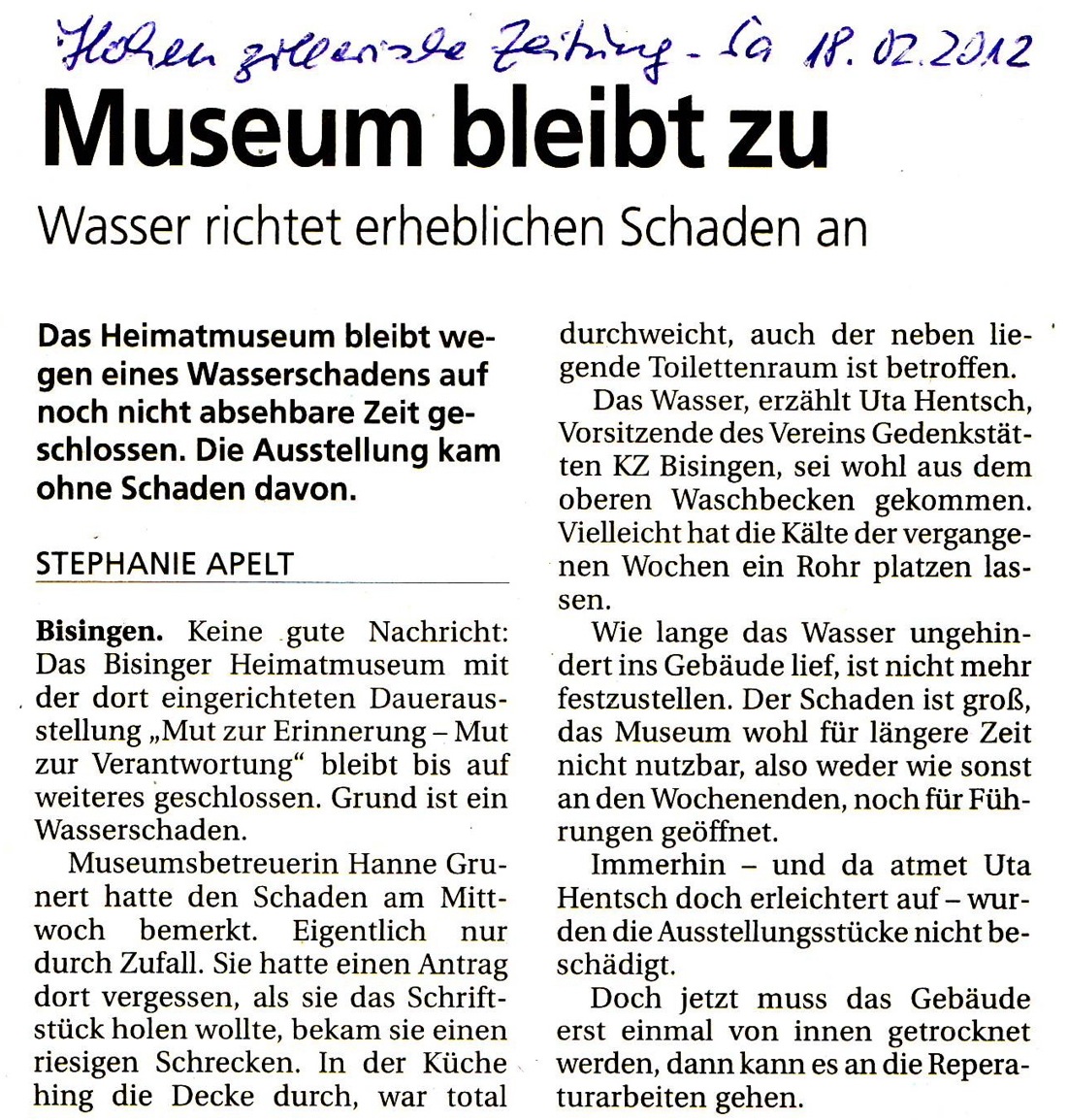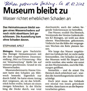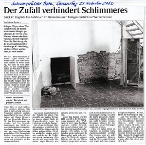 Mittwoch 29. Februar 2012 – in der Hohenzollerischen Zeitung ist im Zusammenhang mit einem Wasserschaden in Thanheim zu lesen, dass der Schaden im Heimatmuseum auf rund 10.000 Euro liegt.