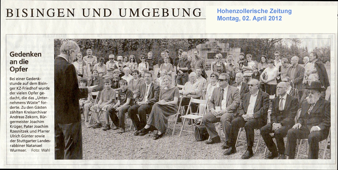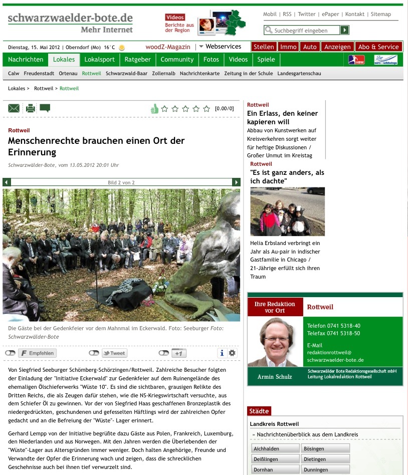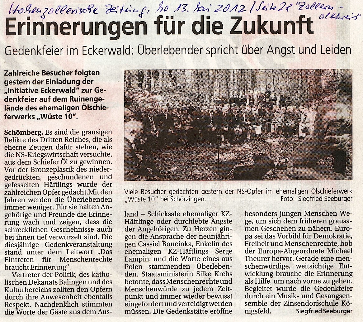 Herr Michael Theurer, Abgeordneter des Europa-Parlaments, hielten zu diesem Thema jeweils kurze Ansprachen. Über den Verlauf des Vormittags im Eckerwald und weitere Gäste aus der politischen Öffentlichkeit kann in den beiden Zeitungsberichten nachgelesen werden. Viele Vorsitzende der verschiedenen Gendenkinitiativen, die im „Gedenkstättenverbund Gäu-Necker-Alb e.V.“ seit April 2010 miteinander vernetzt sind, nahmen an der Veranstaltung tei.l