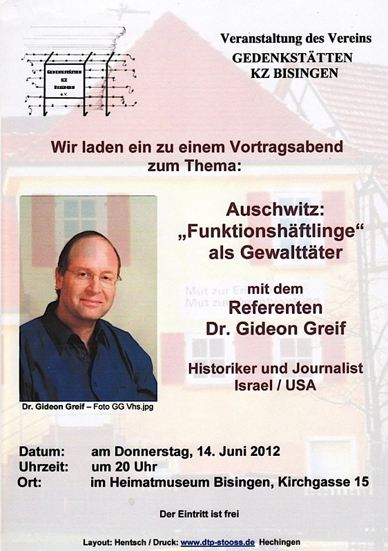 Dr. Gideon Greif Bisingen -1 Veröffentlicht Juni 21, 2012 in 562 × 799 in Prof. Dr. Gideon Greif: Auschwitz „Funktionshäftlinge“ als Gewalttäter Weiter →