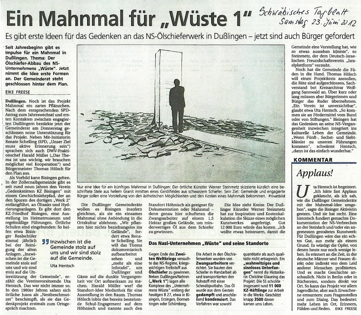 Schwäbisches Tagblatt 23.Juni 2012Mahnmal %22Wüste 1%22 Veröffentlicht Juli 4, 2012 in 1376 × 1200 in „Denk mal“ / „Mahnmal“ / „Manchmal….“ ← Zurück Weiter →
