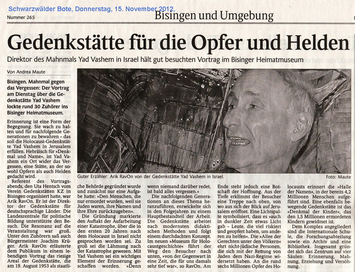 SchwaBo 15.11.2012 Veröffentlicht November 19, 2012 in 1171 × 899 in Yad Vashem – Aufgaben/Ziele/Visionen – Vortrag von Arik Rav-On beim Verein „Gedenkstätten KZ Bisingen“ ← Zurück Weiter →