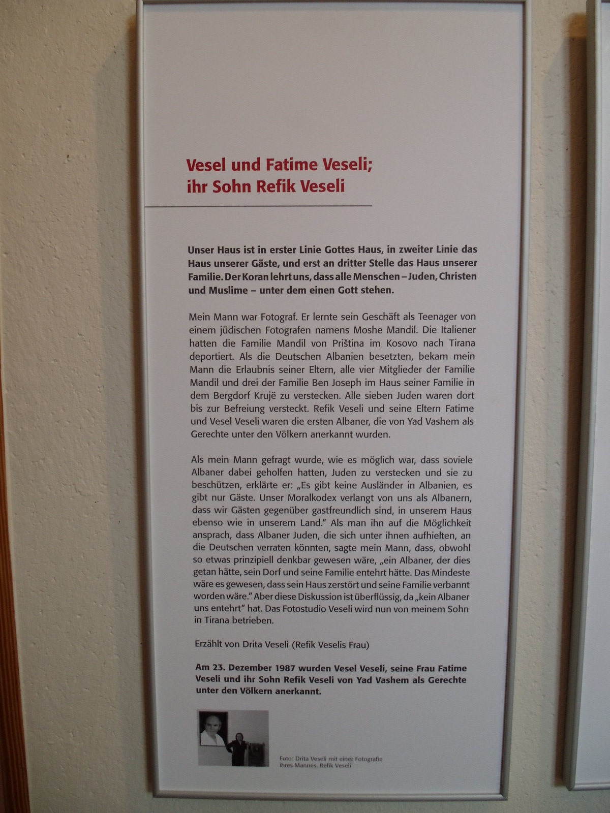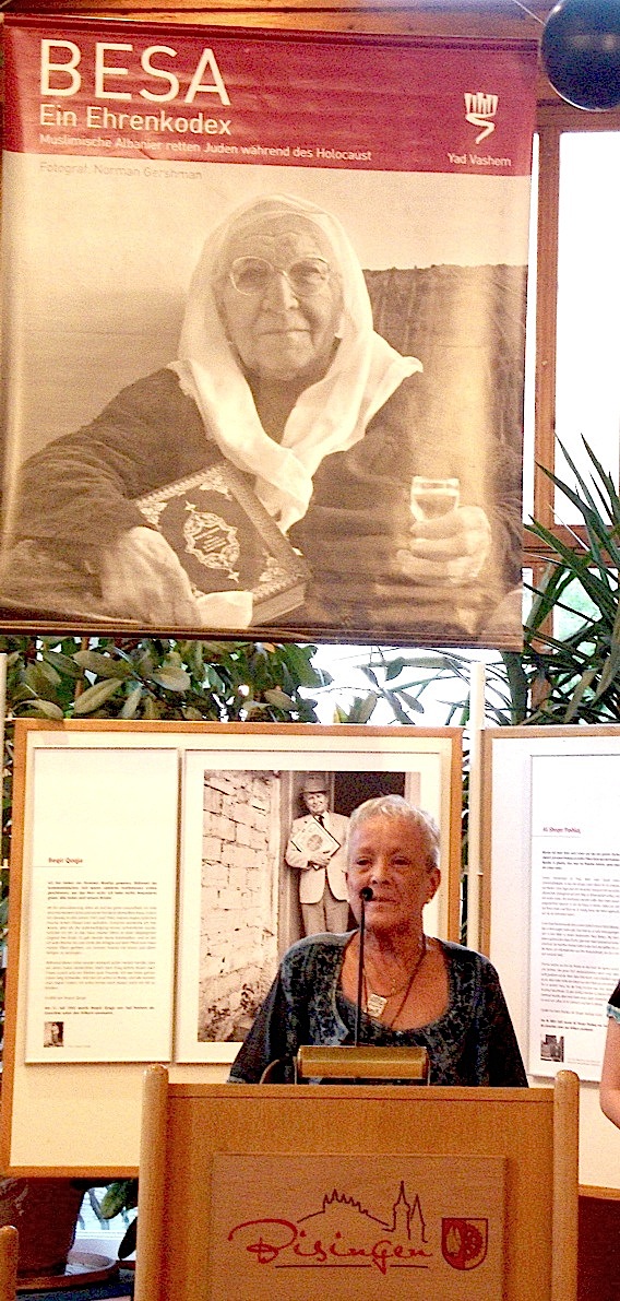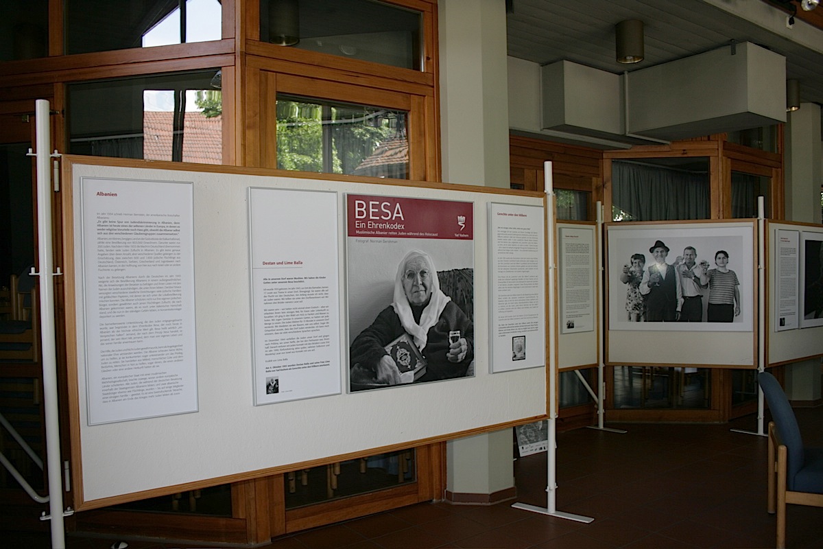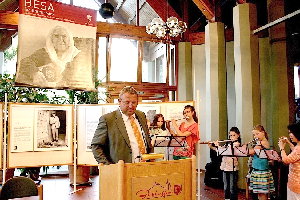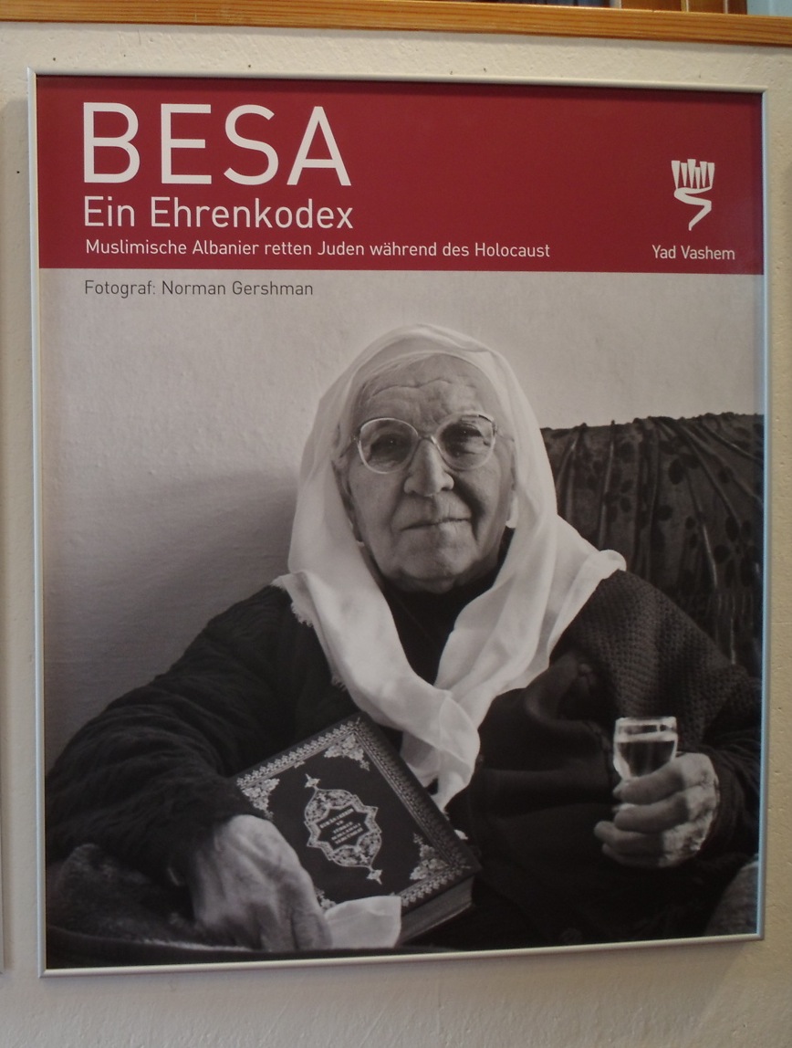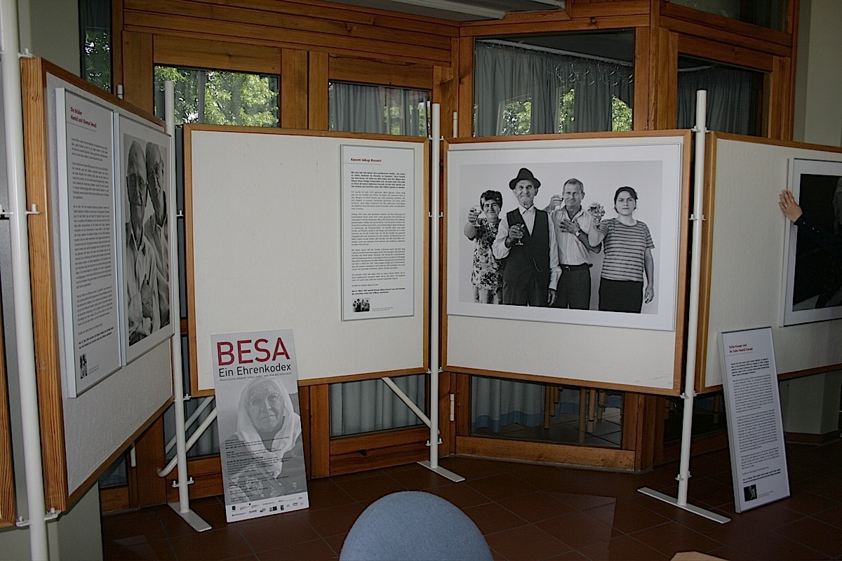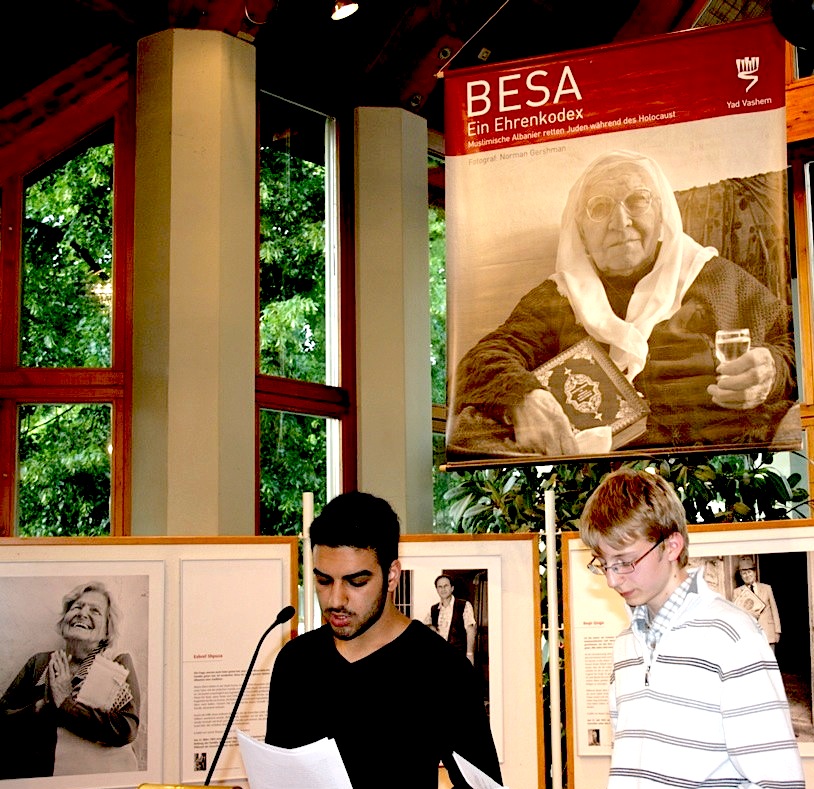 BESA – wörtlich „ein Versprechen halten“ ist ein Ehrenkodex, der noch heute in Albanien als höchster ethischer Wert gilt. Diyar D., Werkrealschule Bisingen, er wird demnächst Aufsicht im Heimatmuseum Bisingen übernehmen, und Martin S., jüngstes Mitglied des Vereins und in der Jugendguide-Ausbildung lasen im Wechsel die Geschichte der albanischen Muslime, und stellten den Fotografen Norman Gershman vor, der die wunderbaren bewegenden Aufnahmen der Familien während seines vier Jahre währenden Aufenthalts in Albanien machte. Es sind 12 einzigartige große Bilder und Texte dieser mutigen Menschen, die ohne zu fragen ihr eigenes Leben riskierten um Juden, vor der Vernichtung durch das NS-Regimes zu retten. 69 muslimische Albaner haben als „Gerechte unter den Völkern“ in Yad Vashem ihren Ehrenplatz. Text zur BESA-Ausstellung.doc