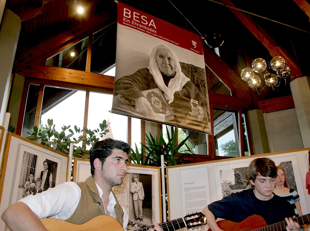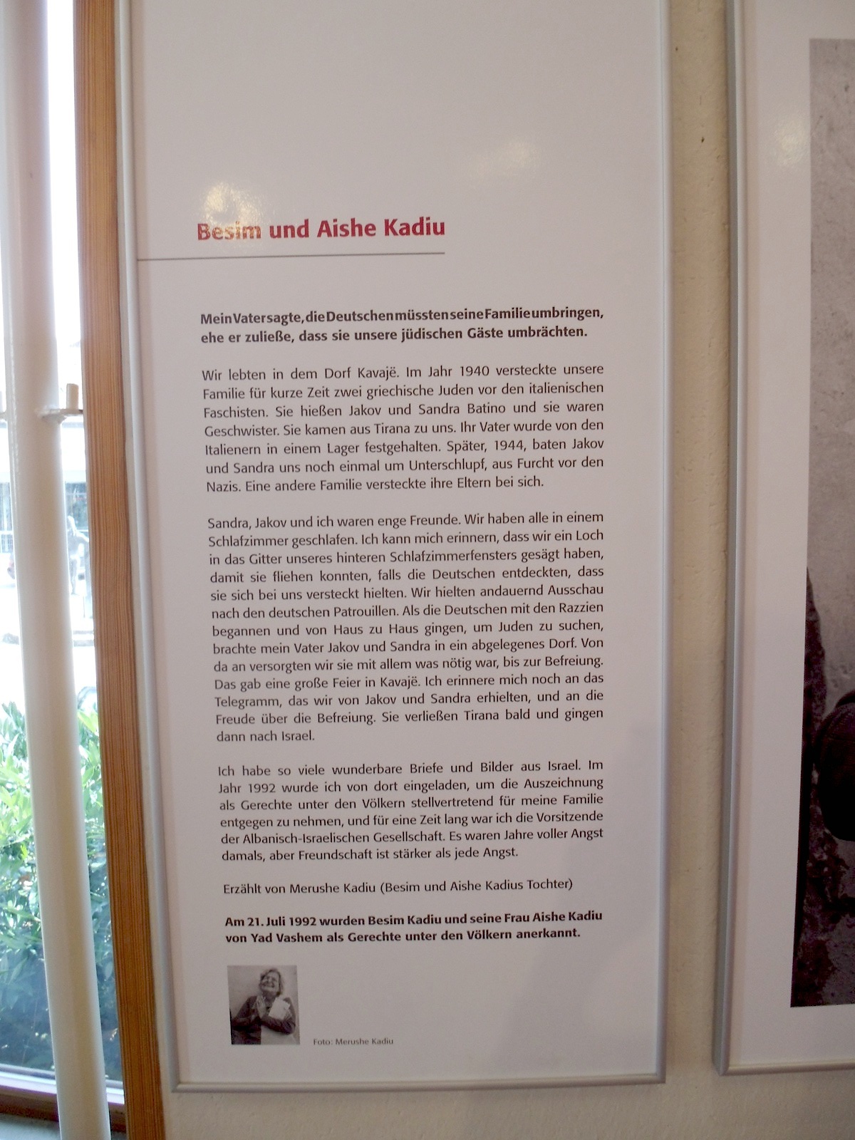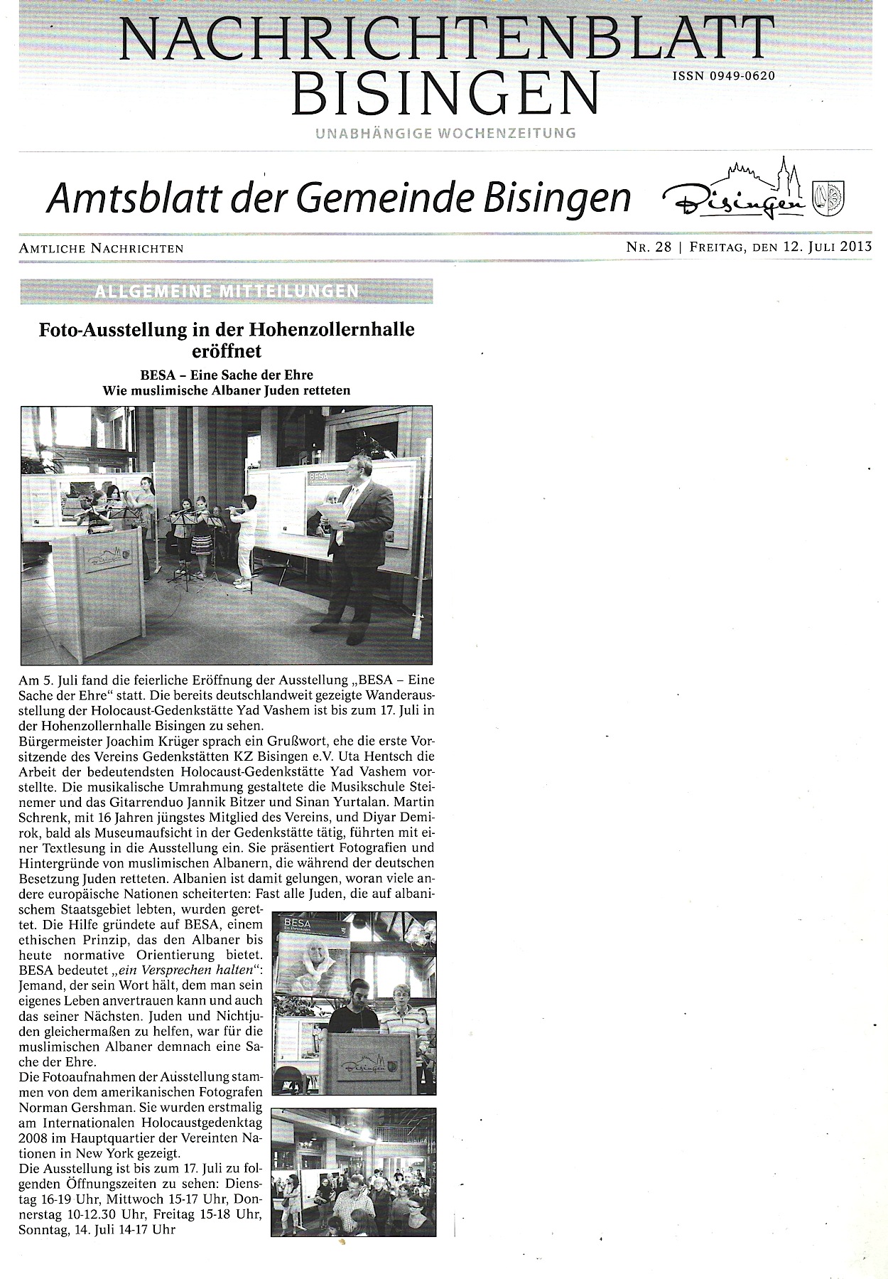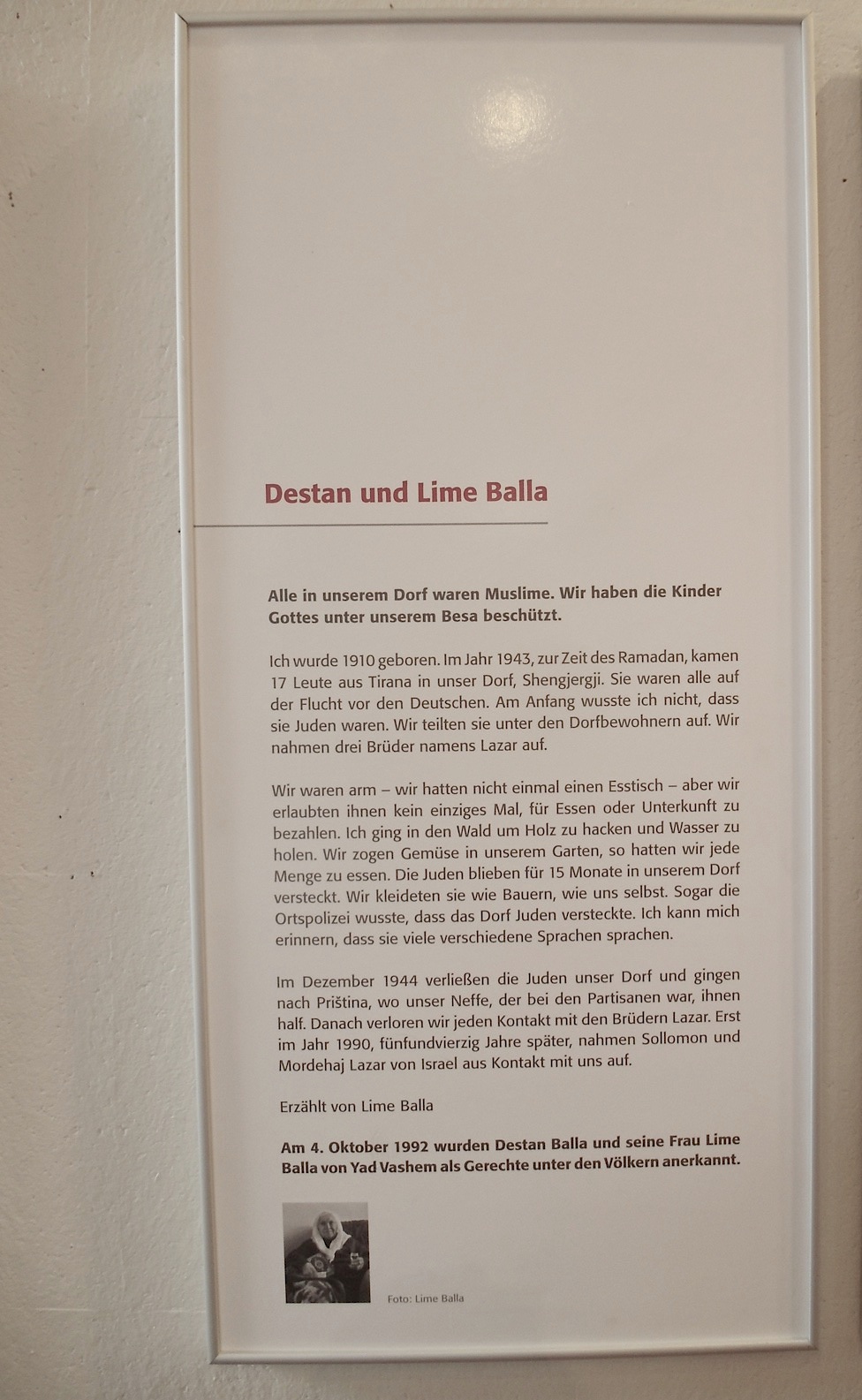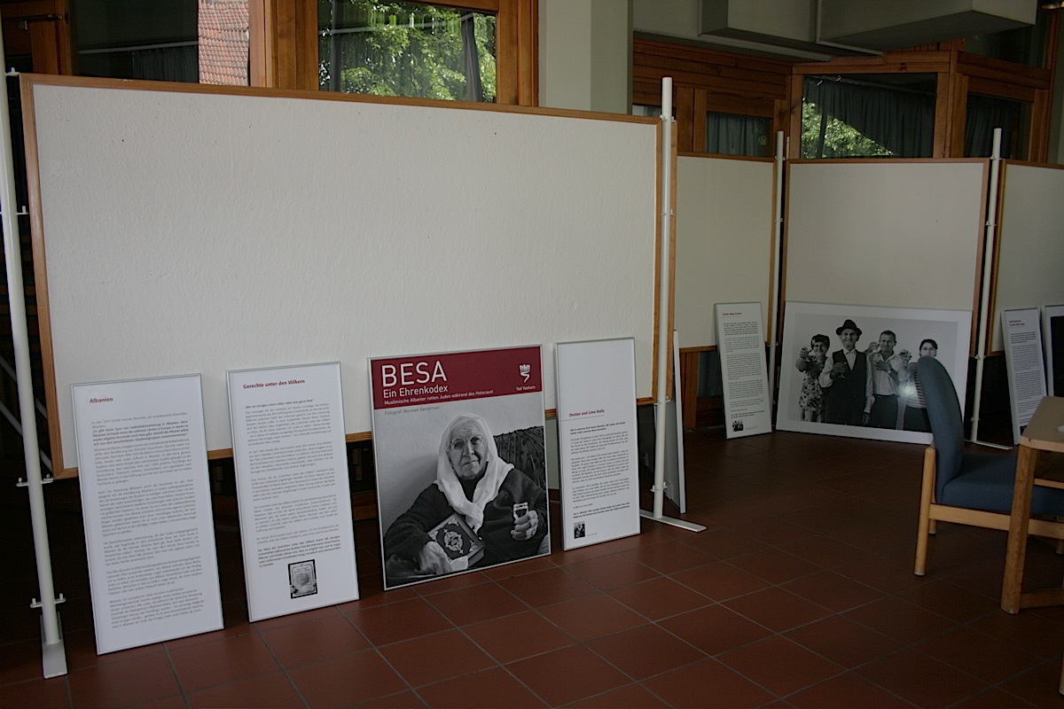 BESA – wörtlich „ein Versprechen halten“ ist ein Ehrenkodex, der noch heute in Albanien als höchster ethischer Wert gilt. Diyar D., Werkrealschule Bisingen, er wird demnächst Aufsicht im Heimatmuseum Bisingen übernehmen, und Martin S., jüngstes Mitglied des Vereins und in der Jugendguide-Ausbildung lasen im Wechsel die Geschichte der albanischen Muslime, und stellten den Fotografen Norman Gershman vor, der die wunderbaren bewegenden Aufnahmen der Familien während seines vier Jahre währenden Aufenthalts in Albanien machte. Es sind 12 einzigartige große Bilder und Texte dieser mutigen Menschen, die ohne zu fragen ihr eigenes Leben riskierten um Juden, vor der Vernichtung durch das NS-Regimes zu retten. 69 muslimische Albaner haben als „Gerechte unter den Völkern“ in Yad Vashem ihren Ehrenplatz. Text zur BESA-Ausstellung.doc