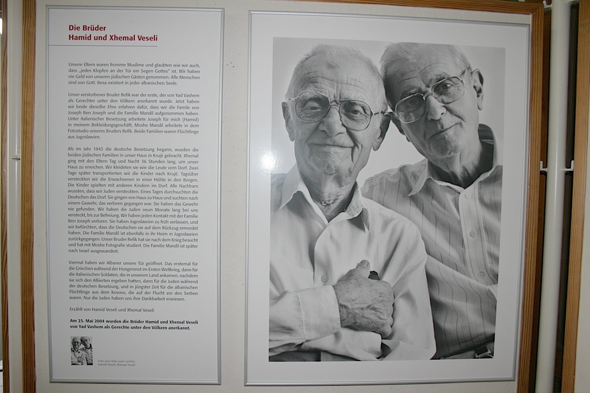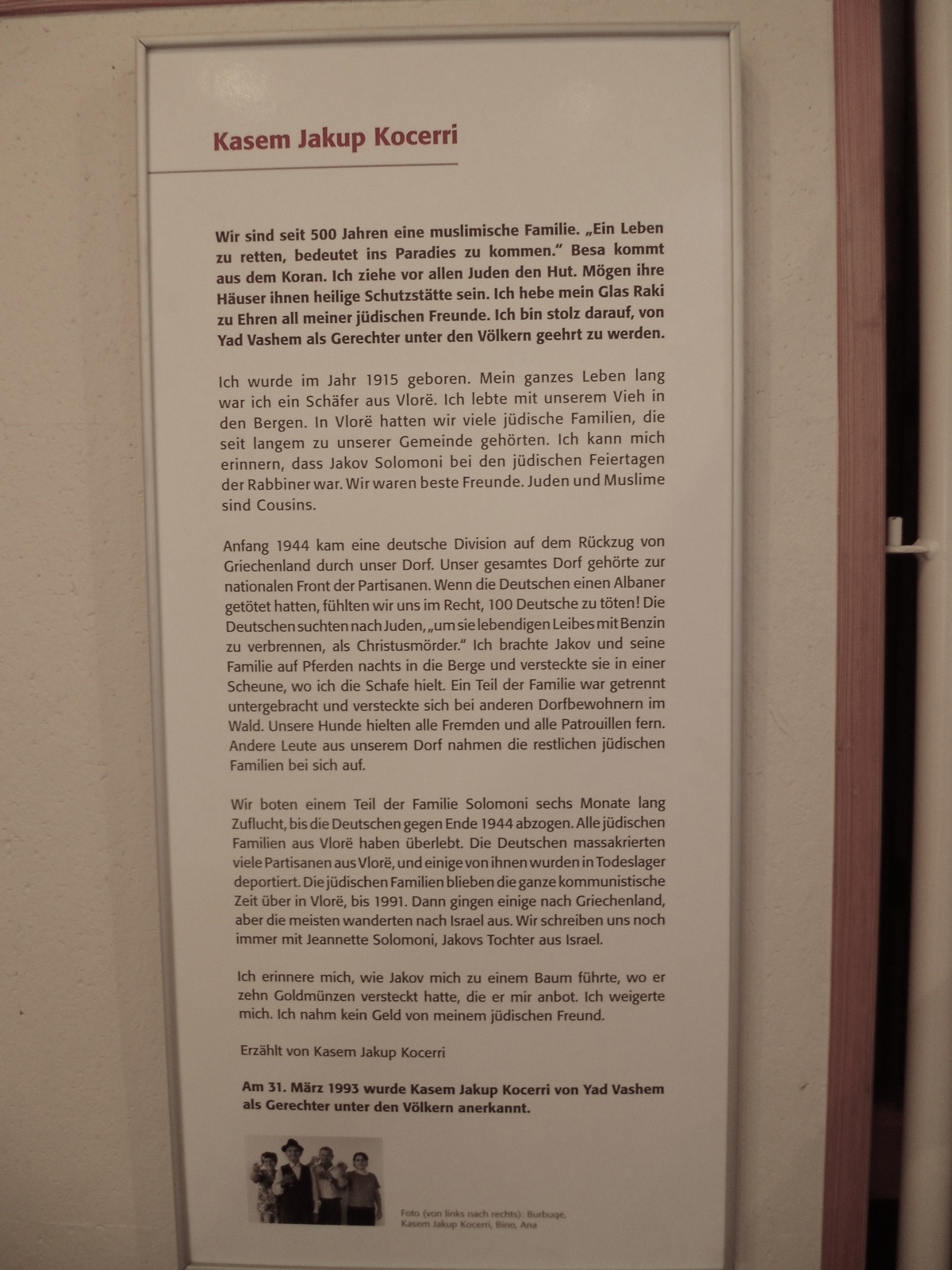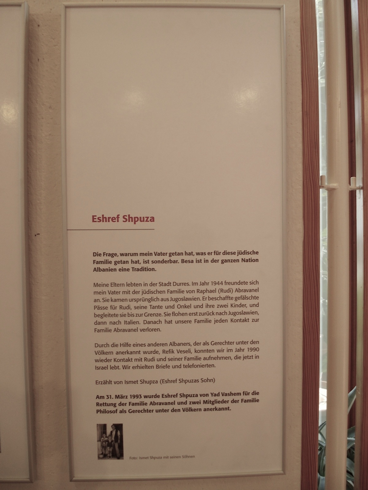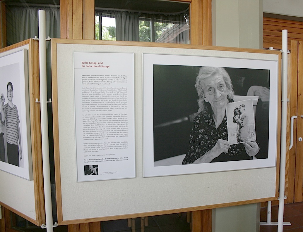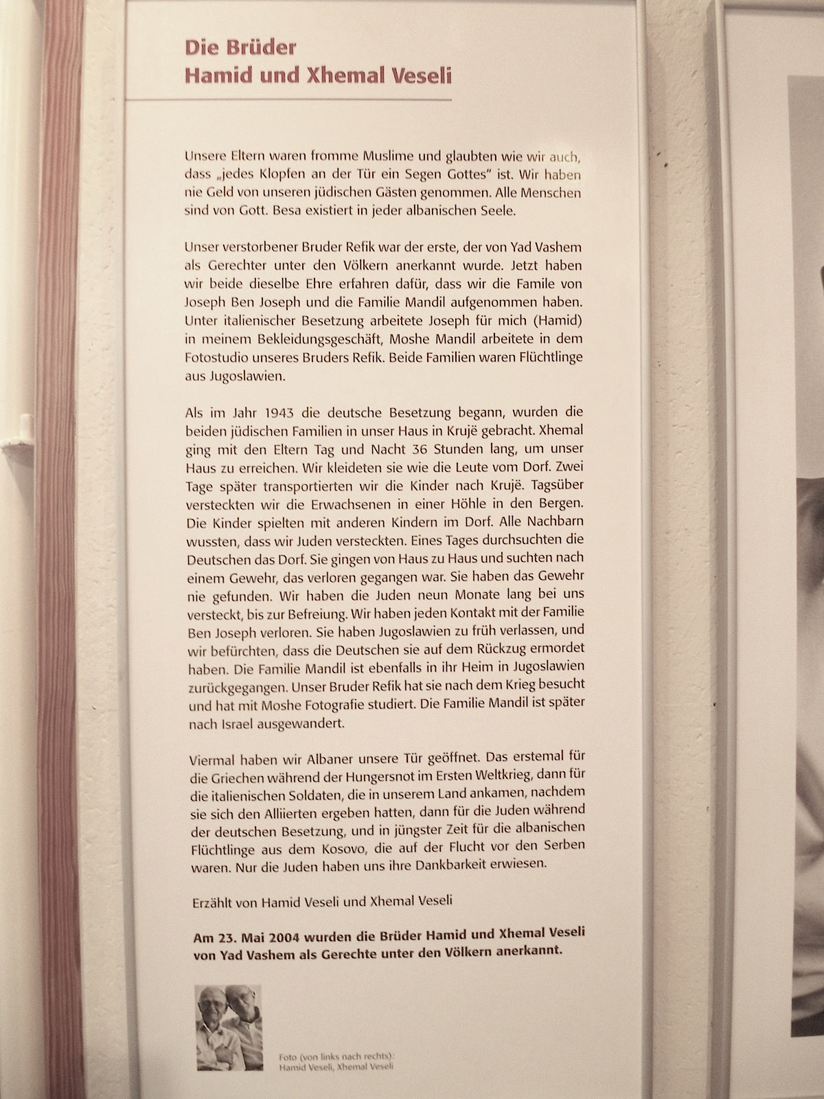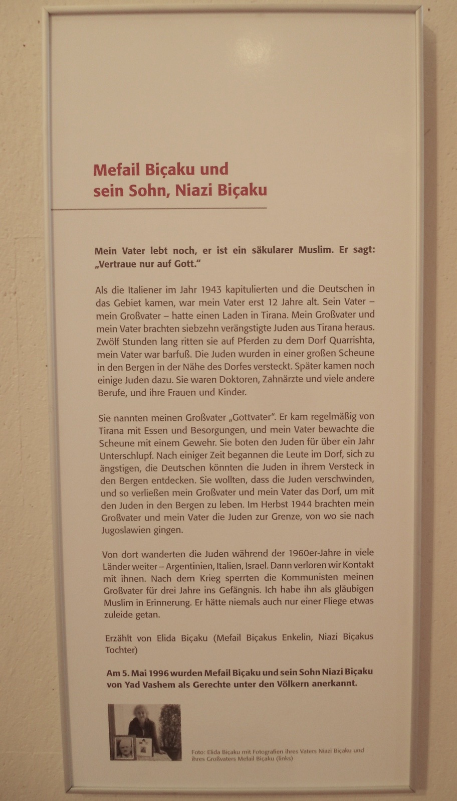 BESA – wörtlich „ein Versprechen halten“ ist ein Ehrenkodex, der noch heute in Albanien als höchster ethischer Wert gilt. Diyar D., Werkrealschule Bisingen, er wird demnächst Aufsicht im Heimatmuseum Bisingen übernehmen, und Martin S., jüngstes Mitglied des Vereins und in der Jugendguide-Ausbildung lasen im Wechsel die Geschichte der albanischen Muslime, und stellten den Fotografen Norman Gershman vor, der die wunderbaren bewegenden Aufnahmen der Familien während seines vier Jahre währenden Aufenthalts in Albanien machte. Es sind 12 einzigartige große Bilder und Texte dieser mutigen Menschen, die ohne zu fragen ihr eigenes Leben riskierten um Juden, vor der Vernichtung durch das NS-Regimes zu retten. 69 muslimische Albaner haben als „Gerechte unter den Völkern“ in Yad Vashem ihren Ehrenplatz. Text zur BESA-Ausstellung.doc