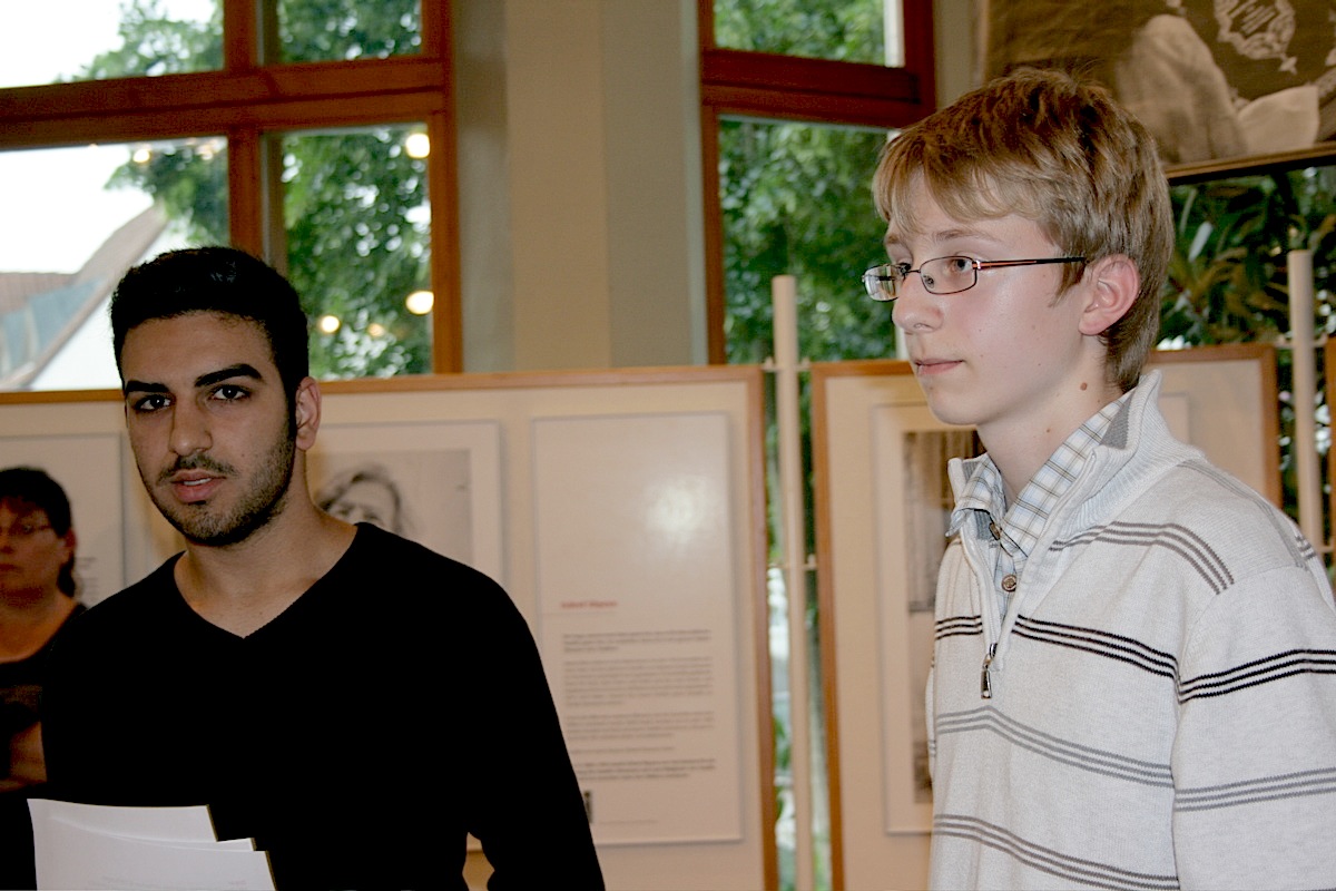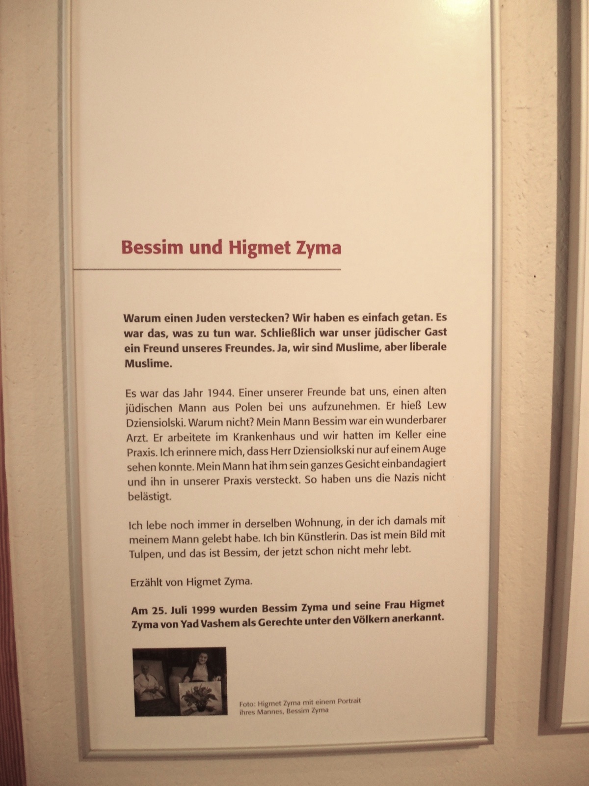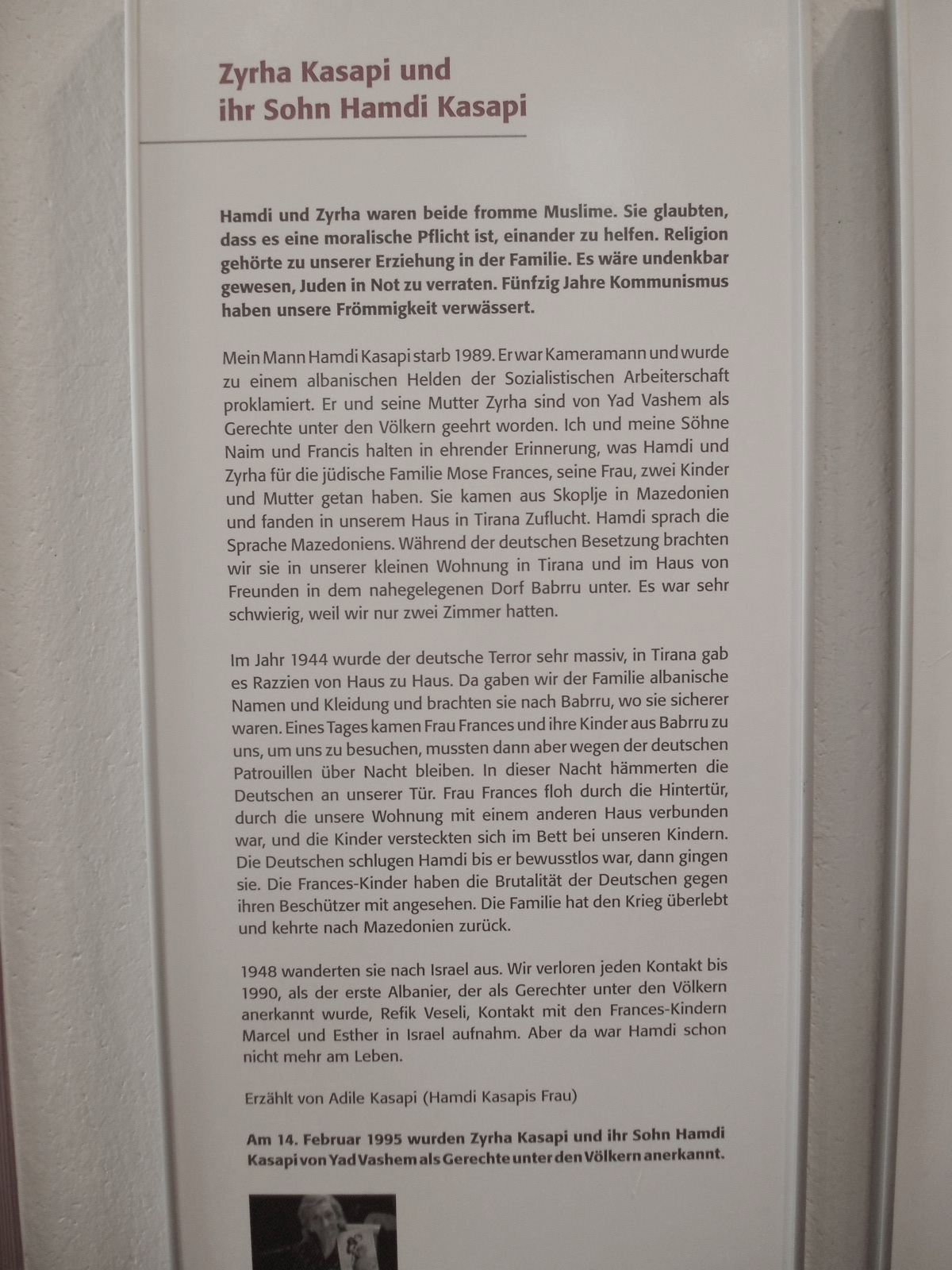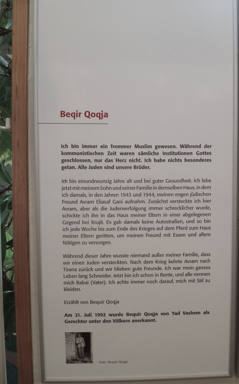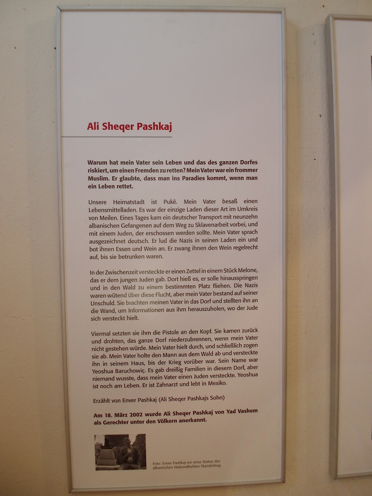 BESA – wörtlich „ein Versprechen halten“ ist ein Ehrenkodex, der noch heute in Albanien als höchster ethischer Wert gilt. Diyar D., Werkrealschule Bisingen, er wird demnächst Aufsicht im Heimatmuseum Bisingen übernehmen, und Martin S., jüngstes Mitglied des Vereins und in der Jugendguide-Ausbildung lasen im Wechsel die Geschichte der albanischen Muslime, und stellten den Fotografen Norman Gershman vor, der die wunderbaren bewegenden Aufnahmen der Familien während seines vier Jahre währenden Aufenthalts in Albanien machte. Es sind 12 einzigartige große Bilder und Texte dieser mutigen Menschen, die ohne zu fragen ihr eigenes Leben riskierten um Juden, vor der Vernichtung durch das NS-Regimes zu retten. 69 muslimische Albaner haben als „Gerechte unter den Völkern“ in Yad Vashem ihren Ehrenplatz. Text zur BESA-Ausstellung.doc