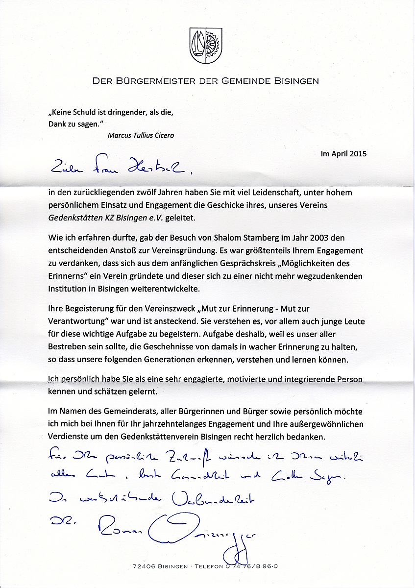 Dabei gehen meine Gedanken an Hanne Grunert, die 2005 von der Gemeinde Bisingen für die Museums- und Gedenkarbeit angestellt wurde und deren Stelle nach ihrem Ausscheiden ab Herbst 2012 von der Gemeinde an Franziska Blum übertragen wurde. Als Kooperationspartnerinnen zwischen der Gemeinde Bisingen und dem Verein sind sie unverzichtbare Bindglieder geworden – auch das ist keine Selbstverständlichkeit – andere Gedenk-Initiativen beneiden uns sogar darum.