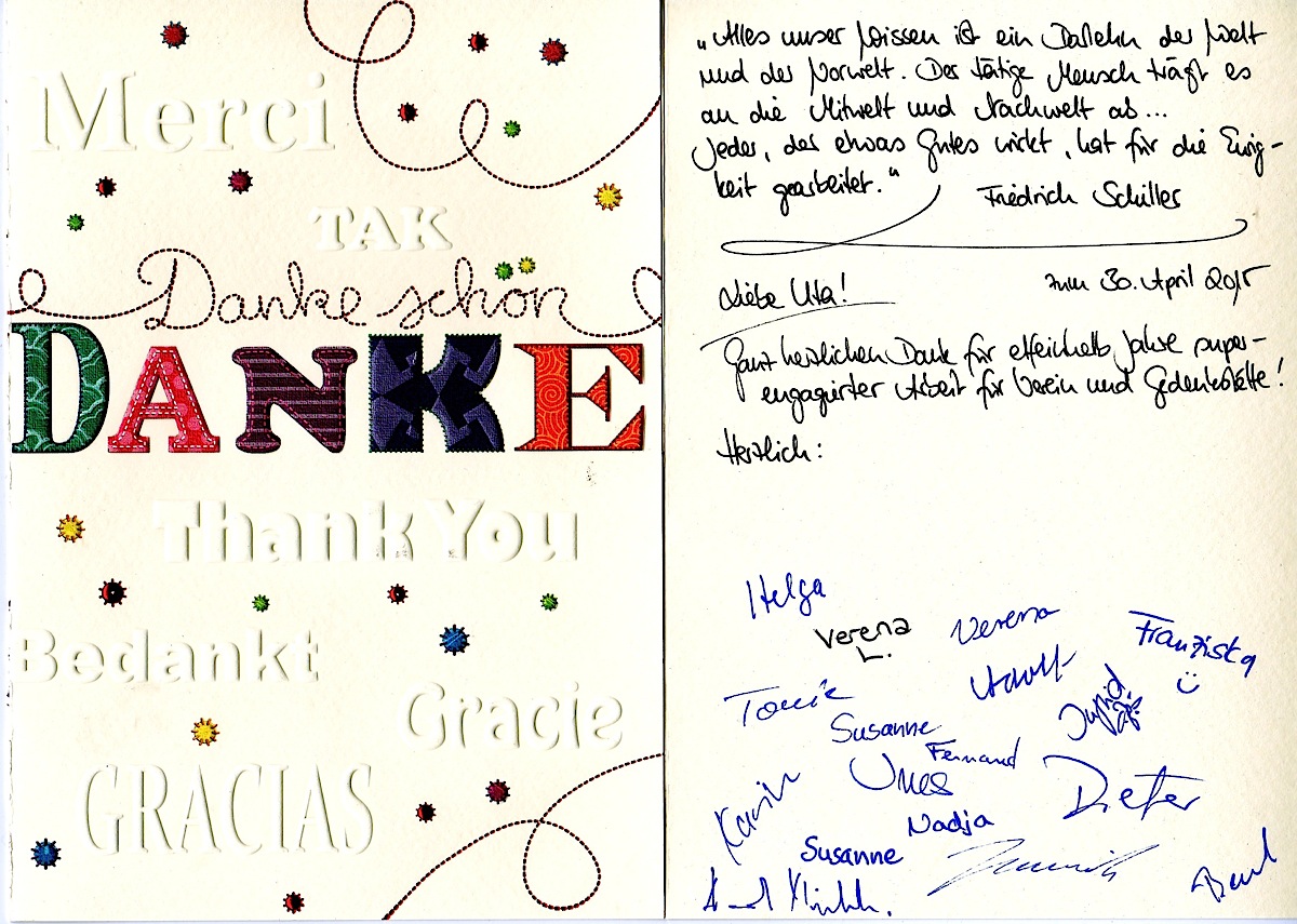 Nachdem ich bereits zur Jahreshauptversammlung 2013 mit Wiederholung im März 2014 gesagt hatte, dass ich den Vorsitz abgeben möchte – danke ich nun Dir, liebe Ines und Dir lieber Dieter, dass Ihr Euch am 30. Juli 2014 dazu entschieden habt den Vorsitz bzw. stellvtretenden Vorsitz zu übernehmen. Ich kann mir keine besseren Nachfolger als Euch beide für diese wichtige Arbeit vorstellen – Ihr erinnert Euch sicher noch an meine Reaktion, als Ihr es mir im vergangenen Sommer gesagt habt – und diese Reaktion kam in der Tat aus meinem Herzen – wie mir die Arbeit von Beginn an – und in all den Jahren eine reine Herzensangelegenheit war. Vieles könnte noch gesagt werden – an dieser Stelle möchte ich jedoch nun einen Schlusspunkt setzen.