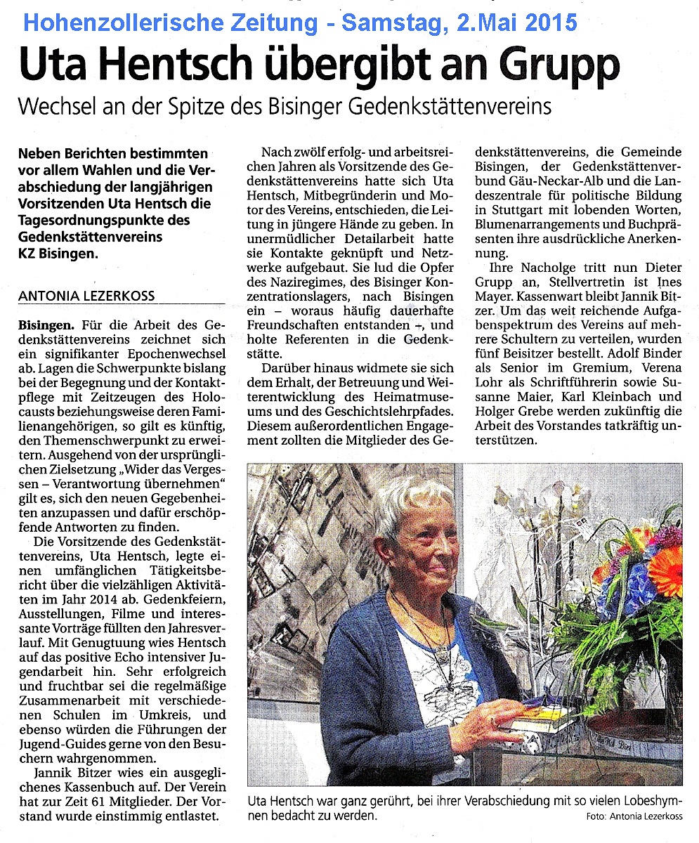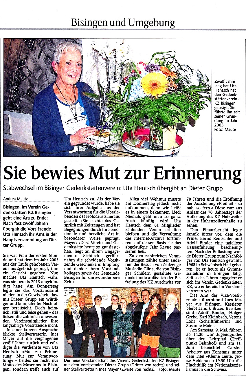 Auf der Jahreshauptversammlung am Donnerstag, 30. April 2015 gab es im Verein Gedenkstätten KZ Bisingen einen umfassenden Stabwechsel. Uta Hentsch, seit Gründung des Vereins, am 28. November 2003 Vorsitzende des Vereins übergab den 1. Vorsitz an Dieter Grupp und Dr. Ines Mayer als stellvertretende Vorsitzende. Mehr darüber kann auch in den beiden Presseberichten nachgelesen werden. Eine so zahlenmäßig große Gruppe von anwesenden Mitgliedern hat es in den vergangenen elfeinhalb Jahren seit Bestehen des Vereins noch nie gegeben – und so wurde die öffentliche Abstimmung für die verschiedenen Positionen, die jeweils einstimmig erfolgte, zu einem großen Vertrauensbeweis für die neue Zusammensetzung des gesamten, neuen Vorstands des Vereins.