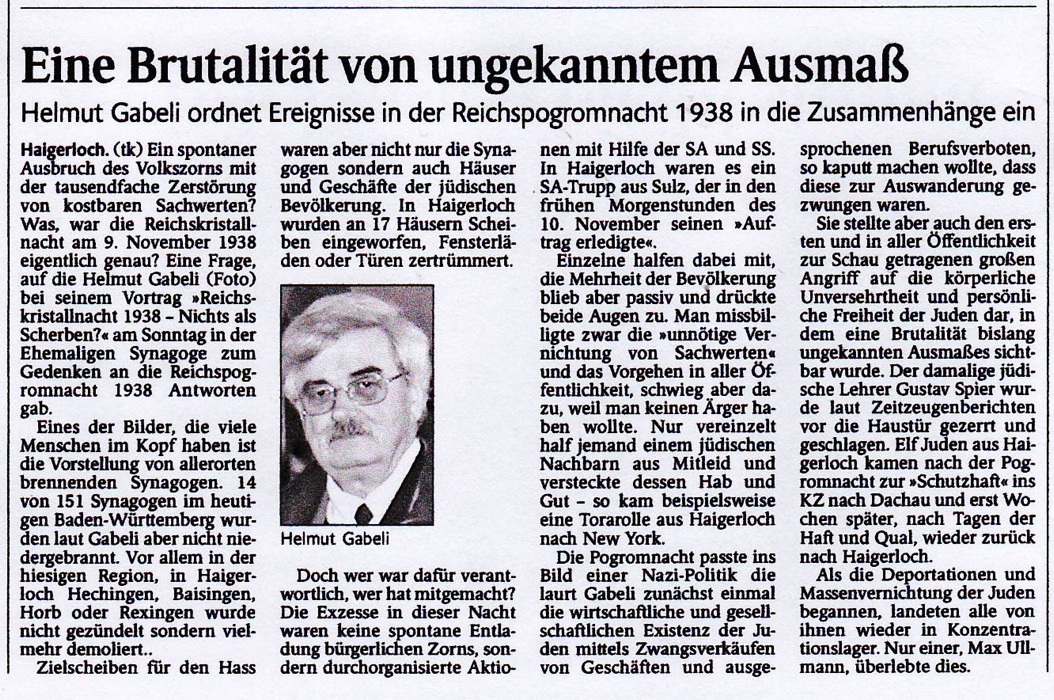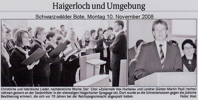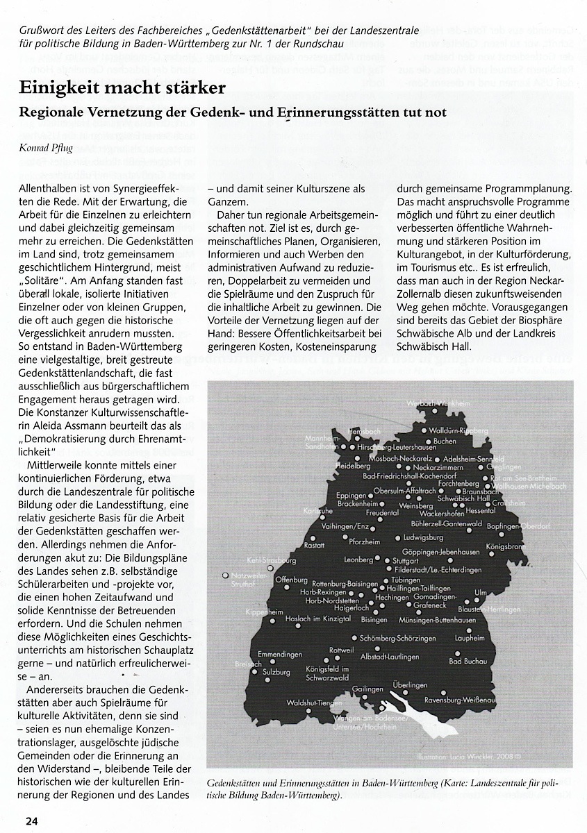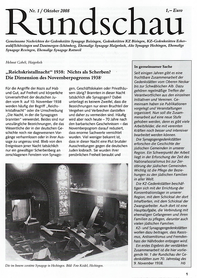 Der 70.ste Jahrestag der Reichspogromnacht am 09. November 2008 war uns Anlass, unsere erste gemeinsame Zeitschrift „Rundschau“ herauszubringen. Jede der sieben Initiativen – Gedenkstätte Synagoge Baisingen, Gedenkstätten KZ Bisingen, KZ-Gedenkstätten Eckerwald/Schörzingen und Dautmergen-Schömberg, Ehemalige Synagoge Haigerloch, Alte Synagoge Hechingen, Ehemalige Synagoge Rexingen, Ehemalige Synagoge Rottweil – ist darin mit einem Beitrag vertreten.