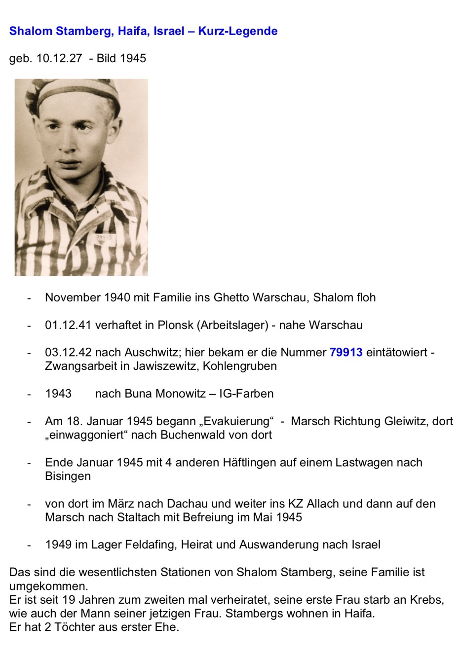 Shalom-Kurz-legendeMit vielen persönlichen Unterlagen (siehe eine Kurzlegende im Bild links) von Shalom Stamberg und mit der sehr realen Aussicht, dass wir uns in Bisingen wiedersehen werden, ging dieser für mich sehr außergewöhnliche erste Besuch bei Stambergs in Haifa mit vielen guten gegenseitigen Wünschen zu Ende.