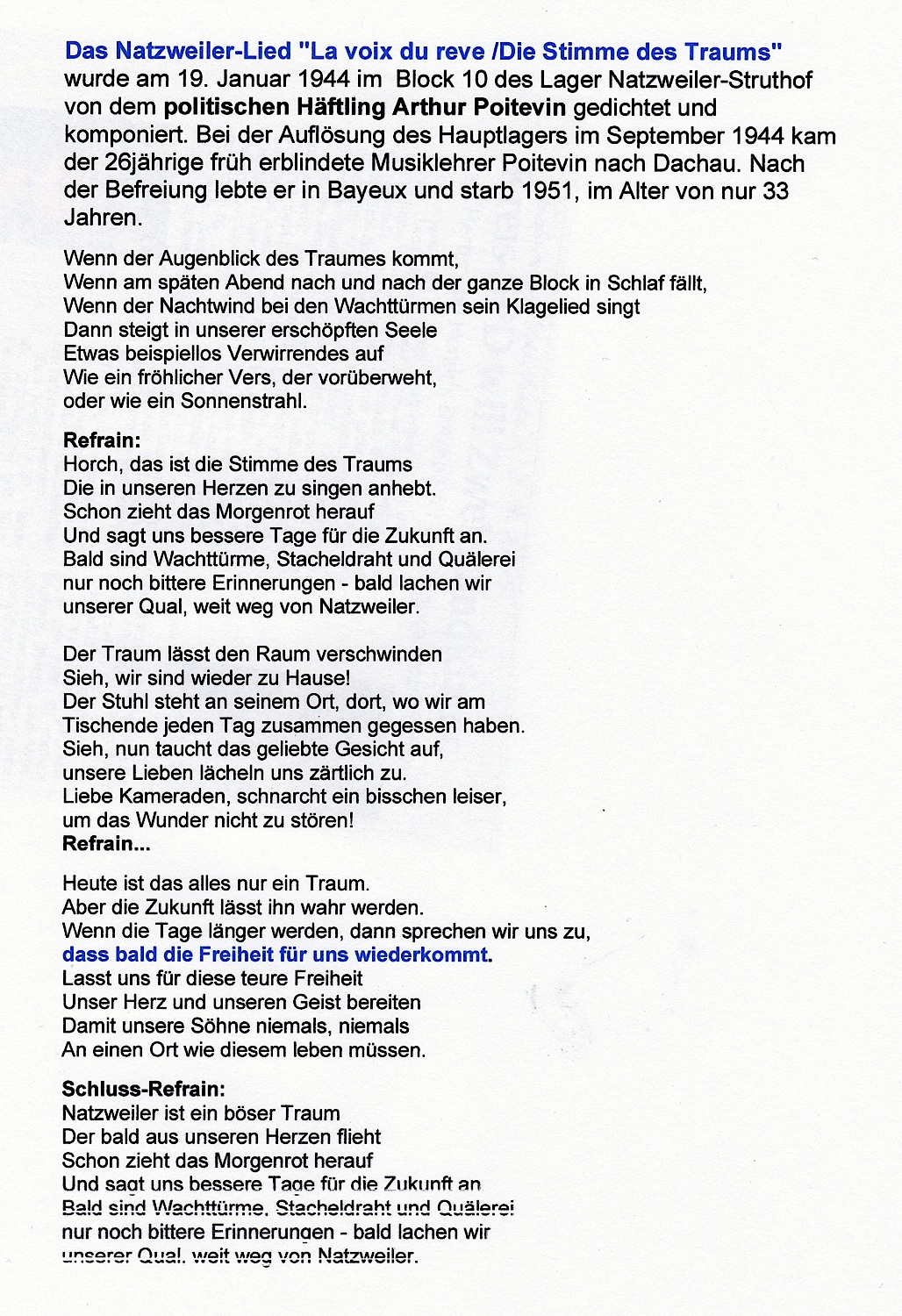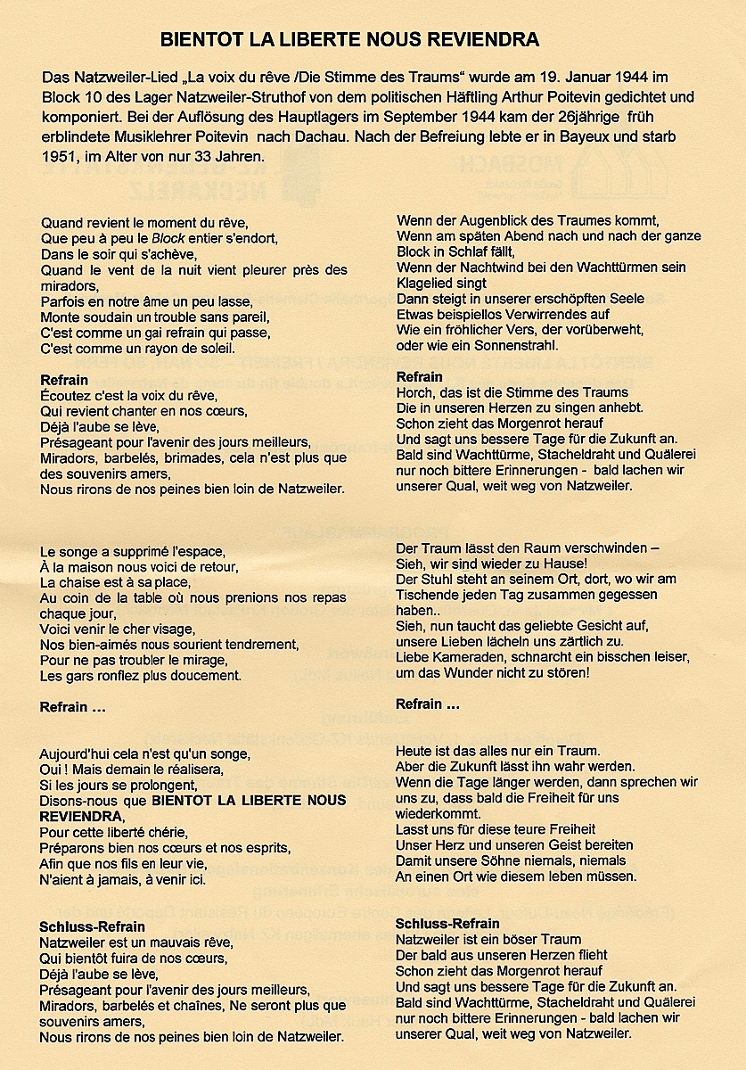 Das „Natzweiler Lied“ enthält den französischen Titel der Ausstellung: „Bientot La Liberte Nous Reviendra“ – mehr dazu im Grußwort von Uta Hentsch