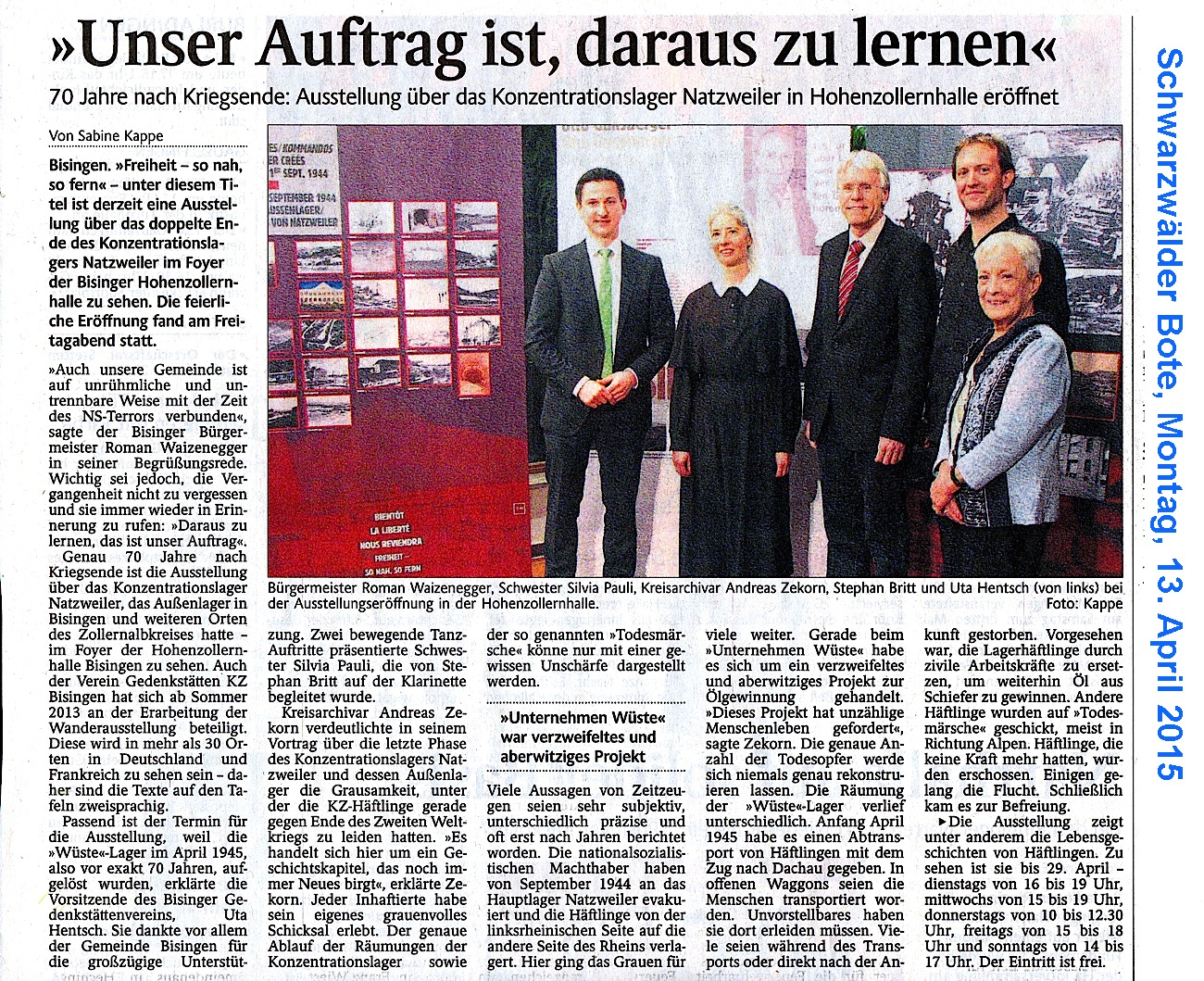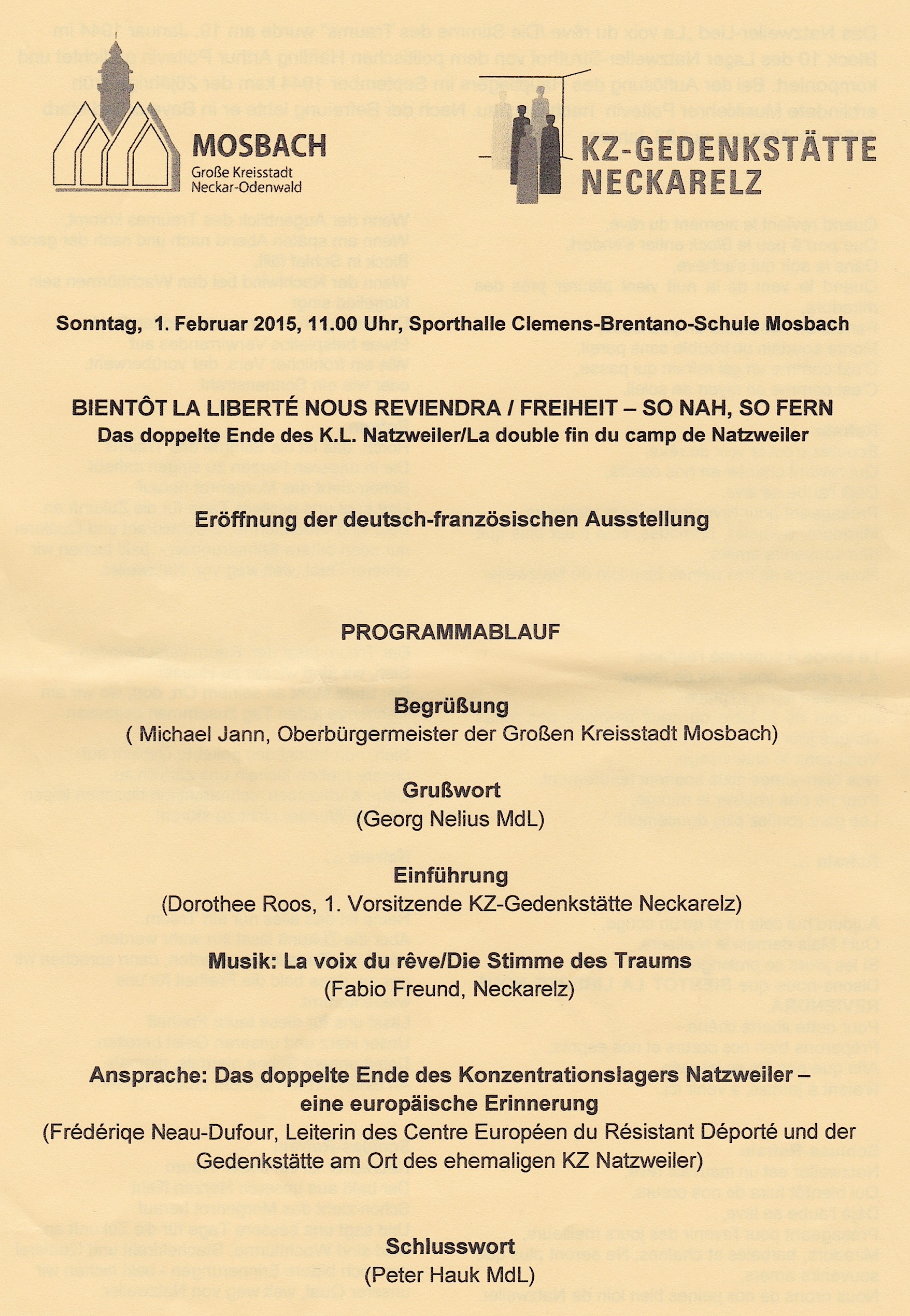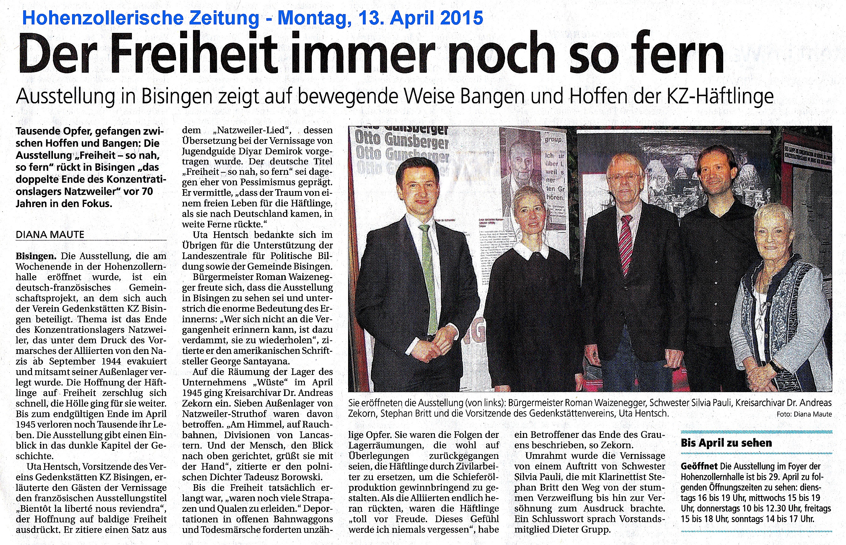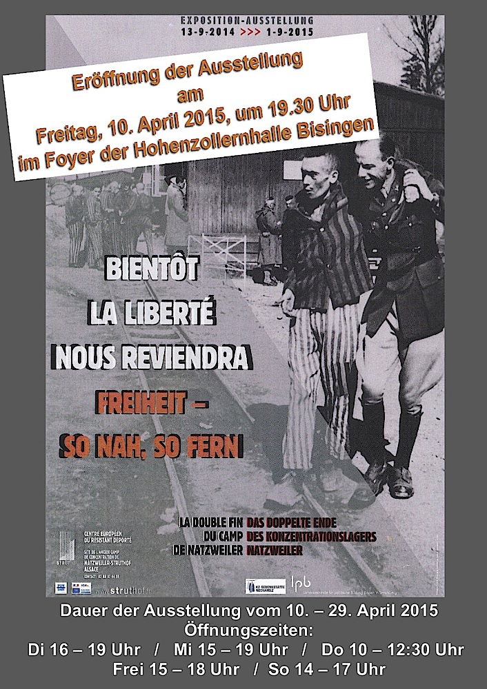 Am Freitag, dem 10. April 2015 wurde aus Anlass des 70. Jahrestag der Auflösung des Konzentrationslagers Natzweiler links und rechtes des Rheins in der Hohenzollernhalle Bisingen die Ausstellung: „BIENTOT LA LIBERTE NOUS REVIENDRA – FREIHEIT – SO NAH, SO FERN“ eröffnet.