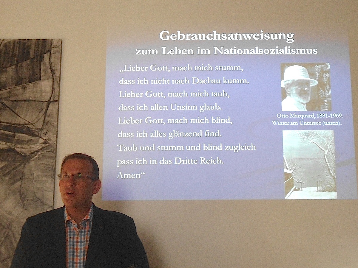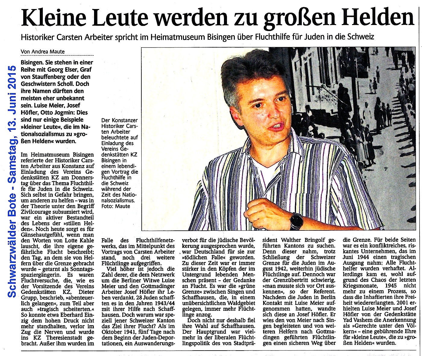 Carsten Arbeiter wird das Fluchthilfenetzwerk um die Berliner Witwe Luise Meier und den Gottmadinger Arbeiter Josef Höfler vorstellen und zeigen, dass auch „kleine Leute“ die Unmenschlichkeit des NSRegimes erkannten und mutig genug waren, bei großem persönlichem Risiko anderen Menschen zu helfen. 28 Juden konnten dank Luise Meier und Josef Höfler in den Jahren 1943 und 1944 in die Schweiz fliehen. Damit gehört dieses Fluchthilfe-Netzwerk zu den erfolgreichsten in Deutschland.