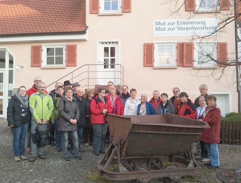 Am Volkstrauertag gedenkt man traditionell der Opfer von Krieg und Gewaltherrschaft. Das ist kein Tag für eine Wanderung, meinen Viele im Schwäbischen Albverein. Warum eigentlich nicht, fragte sich Uli Gänzle von der Ortsgruppe Mittelstadt und organisierte einen dem Tag angemessenen Ausflug. Als Jugendlicher war er öfters mit seinen Eltern am KZ-Friedhof in Bisingen vorbeigefahren. Als Erwachsener hat er sich daran erinnert und nachgeforscht, was es damit auf sich hat. Dabei hat er die Ausstellung über das KZ Bisingen im Heimatmuseum und den Geschichtslehrpfad entdeckt.  Jetzt war er mit 22 Wanderfreunden aus Mittelstadt, Oferdingen, Betzingen, Sondelfingen, Süßen, Burladingen und Ringingen dort.  Die meisten der Teilnehmer wussten zwar, dass es auch bei uns KZ-Lager gegeben hat, aber von Bisingen hatten sie bisher nichts oder nur wenig gehört.