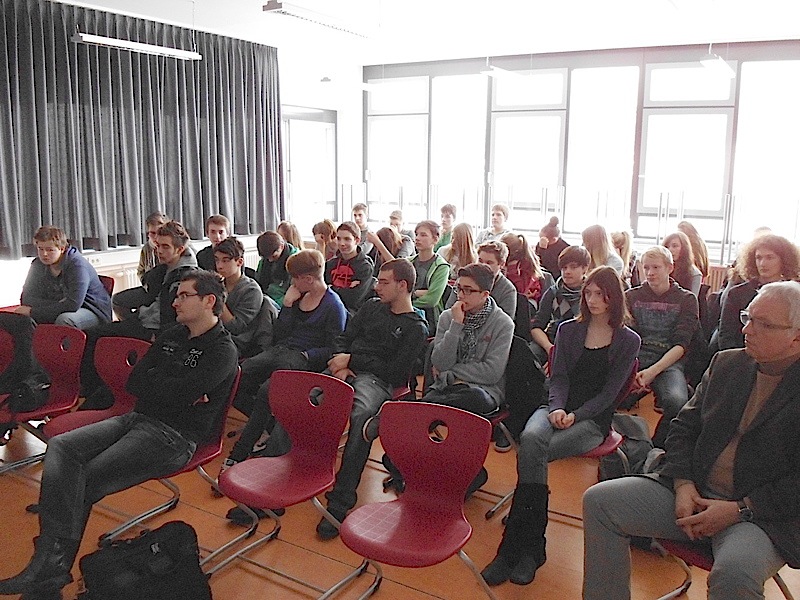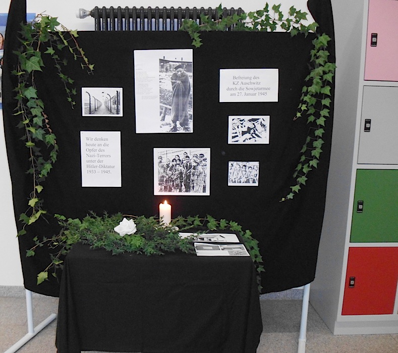 ←Dekoration  zum jeweils am  Januar in er Eingangshalle der Realschule. Am Vormittag 27. Januar 2013 waren 40 Schüler und Schülerinnen der Klassen 9 a und b in der 6. Stunde 27.01.2013 - Schüler Realschule Bisingenzusammen gekommen. Rektor Tröger begrüßte die Schüler und Lehrer mit einem Hinweis zum Thema dieser Stunde. Gezeigt wurde ein 23 minütiger Film, der kleine Sequenzen  das Konzentrationslager Auschwitz-Birkenau selbst – über vergangene Gedenkfeiern, Mengeles verbrecherische Versuche an Zwillingen, die Rolle des Zyklon B, Täter, Opfer, Befreiung durch die Rote Armee zum Inhalt hatte. Einige Zeitzeugen gaben darin ein kurzen Kommentar zur jeweiligen Thematik. So erhielten die jungen SchülerInnen einen nachhaltigen Eindruck über die NS-Verbrechen.
