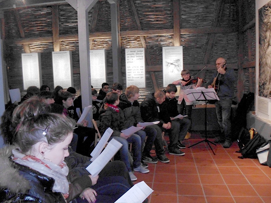 Dienstag, 29. Januar 2013 – wie schon seit vielen Jahren zuvor kamen 40 Schüler der Klassen 9 und b der Grund-Haupt-und Werk-Realschule Bisingens am Vormittag ins Heimatmuseum. Nach dem 27.01.2013 Schüler zünden Kerzen27.01.2013 - Schüler und Lehrer:Heimatmuseum BisingenAnzünden der Kerzen gab es eine Einführung, siehe oben, lasen Schüler kleine Beiträge zum Thema des nachfolgenden Liedes – es waren wie auch in den Jahren zuvor bekannte Antikriegslieder wie „Sag mir wo Blumen steh’n“ – „Blowin In The Wind“ – We Shall Overcome“ und zum Abschluss des bekannte Lied der Versöhnung. Begleitet wurden die Schüler von ihrer Lehrerin Frau Billet-Barfuß und ihrem Lehrer Herrn Merz.