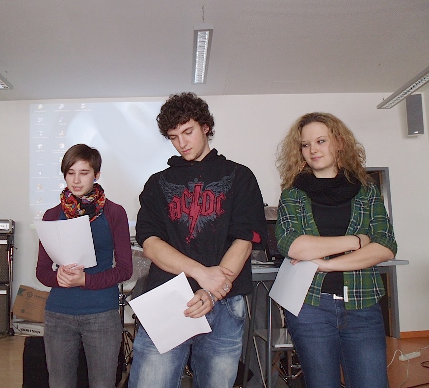 27.01.2013 -Verena G., Fabian Sch.,  Julia L.(← von li nach re Verena G., Fabian Sch., und Julia L.) Frau Bames, Lehrerin an der Realschule Bisingen hatte ein kleines Programm  für drei SchülerInnen der 10. Klasse zusammen gestellt. Es wurden kurze Auszüge aus Otto Gunsbergers „Berufswahl“ – er hat in seinen Aufzeichnungen äußerst eindrücklich über seine kurze Zeit im KZ Bisingen (vom 07. März 1945 bis zur Auflösung des KZ’s im April 1945 berichtet) gelesen und zum Abschluss wurde das Zitat von Martin Niemöller verlesen: